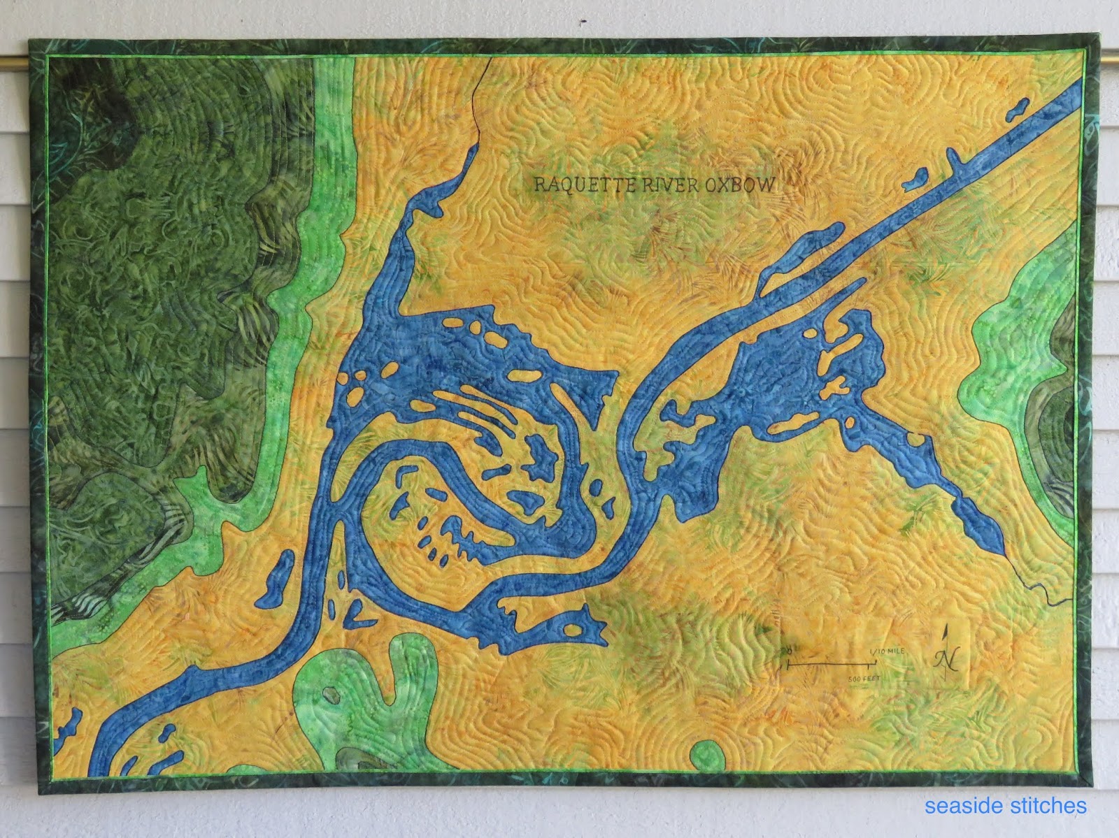I love this quilt! It depicts the oxbow on the Raquette River in the town of Tupper Lake, NY. My family has been there several times, camping, canoeing, kayaking and visiting the Wild Center. My daughter was an intern there through the summer of 2015. So this spot holds a lot of memories for us.