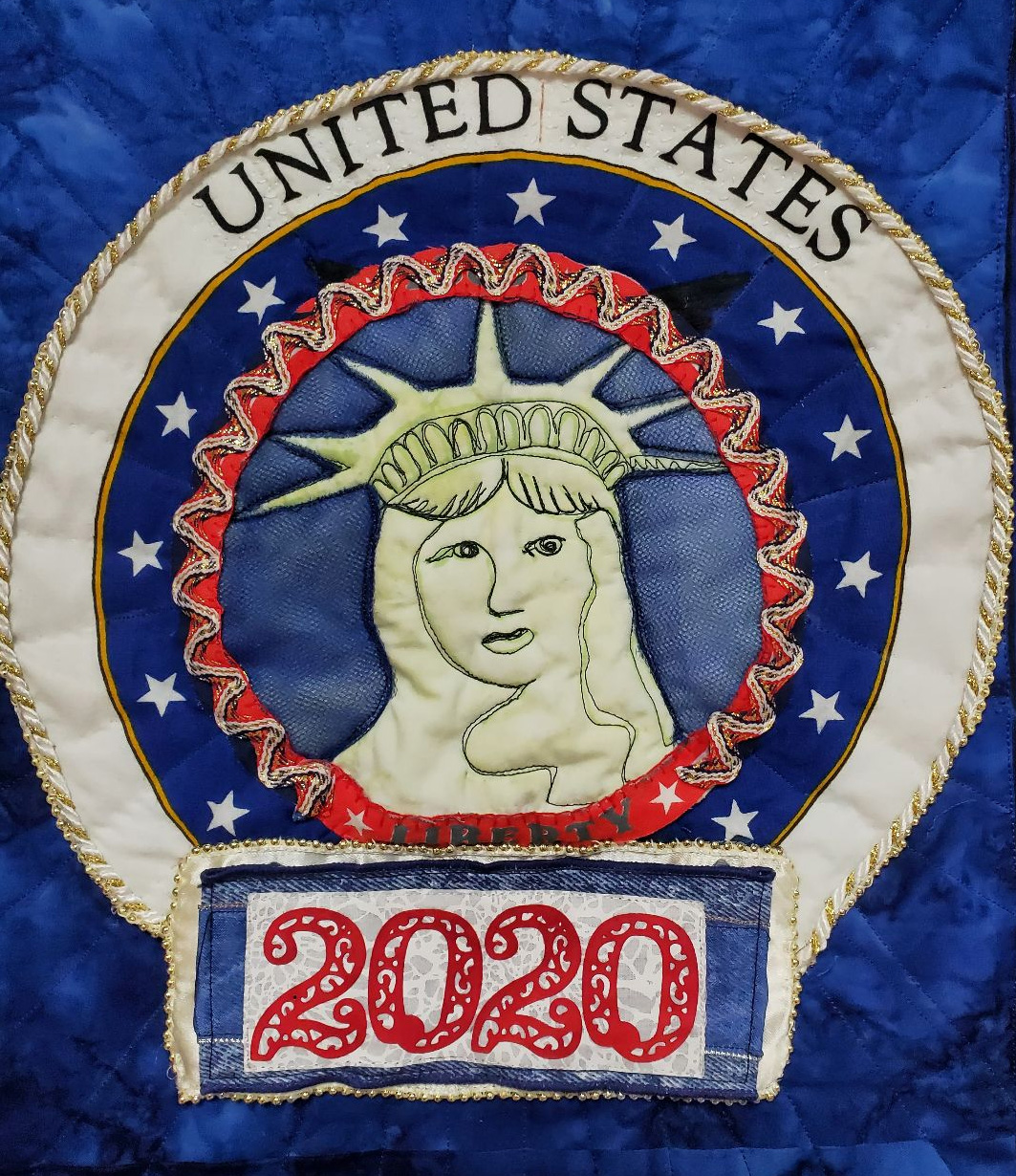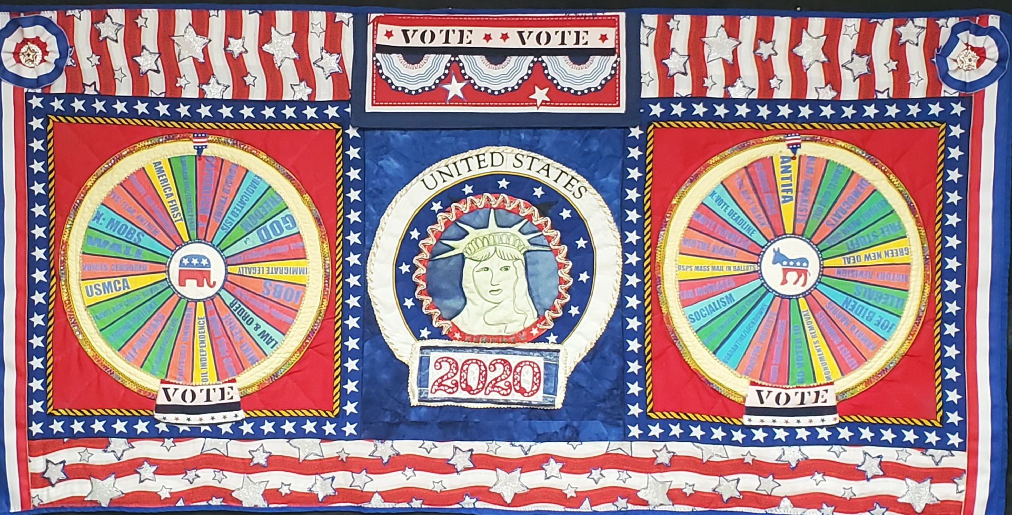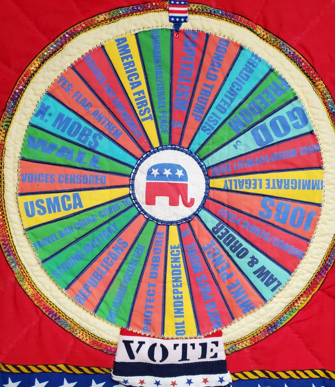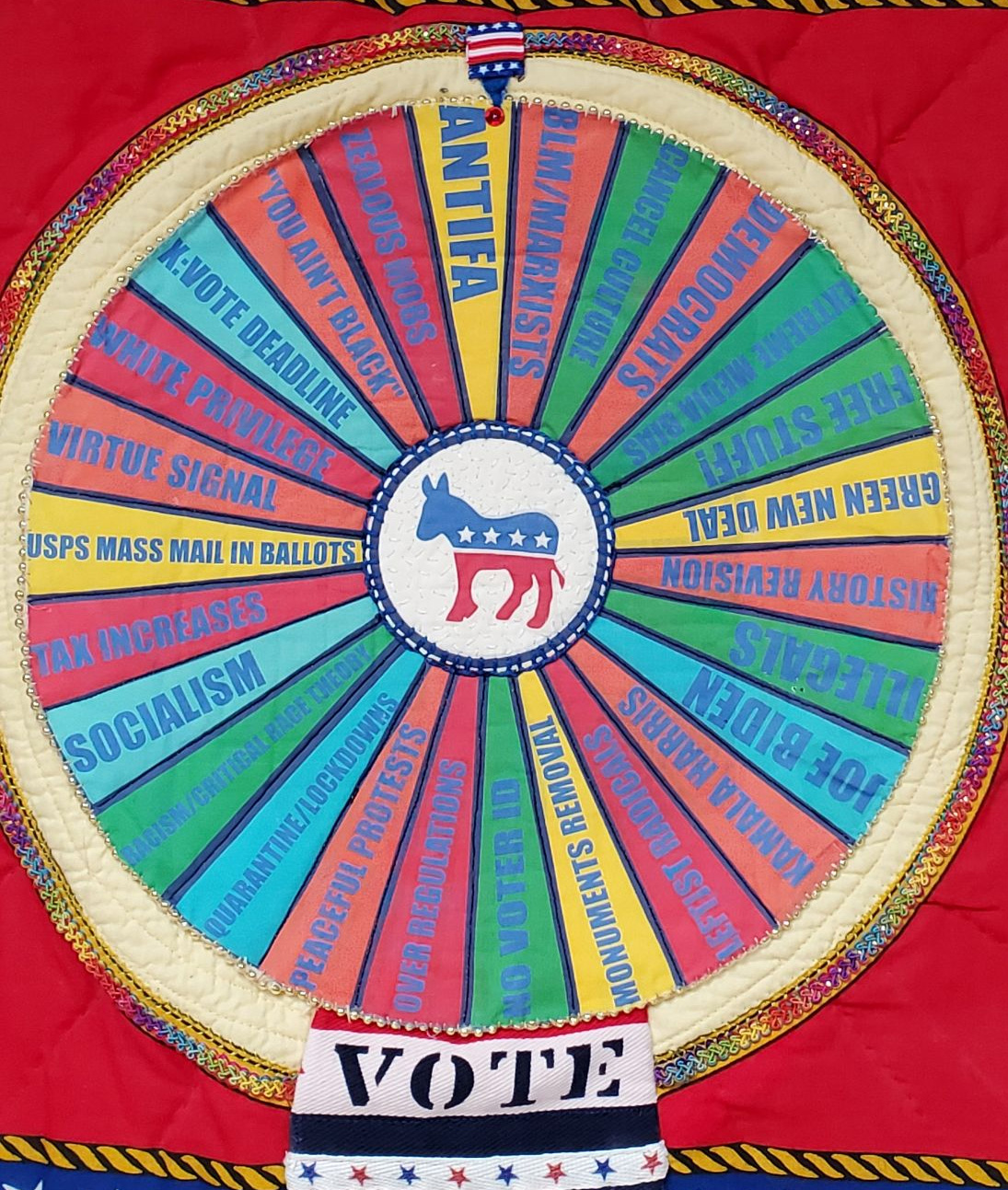 Made a list from A to Z of each political party, designed the quilt in software. Some text is printed on fabric, some are diecuts.