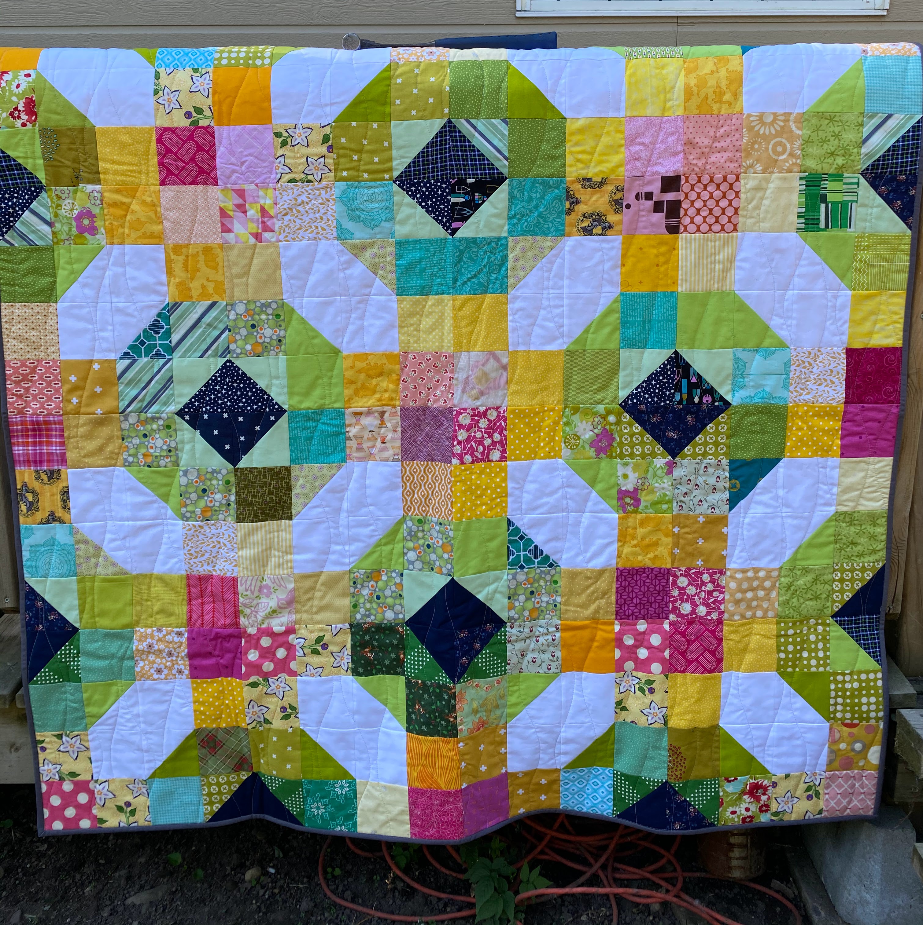 This is the August block which is crazy simple to sew, but when you put a few of them together in a quilt (in this case 9), they create a really striking design.