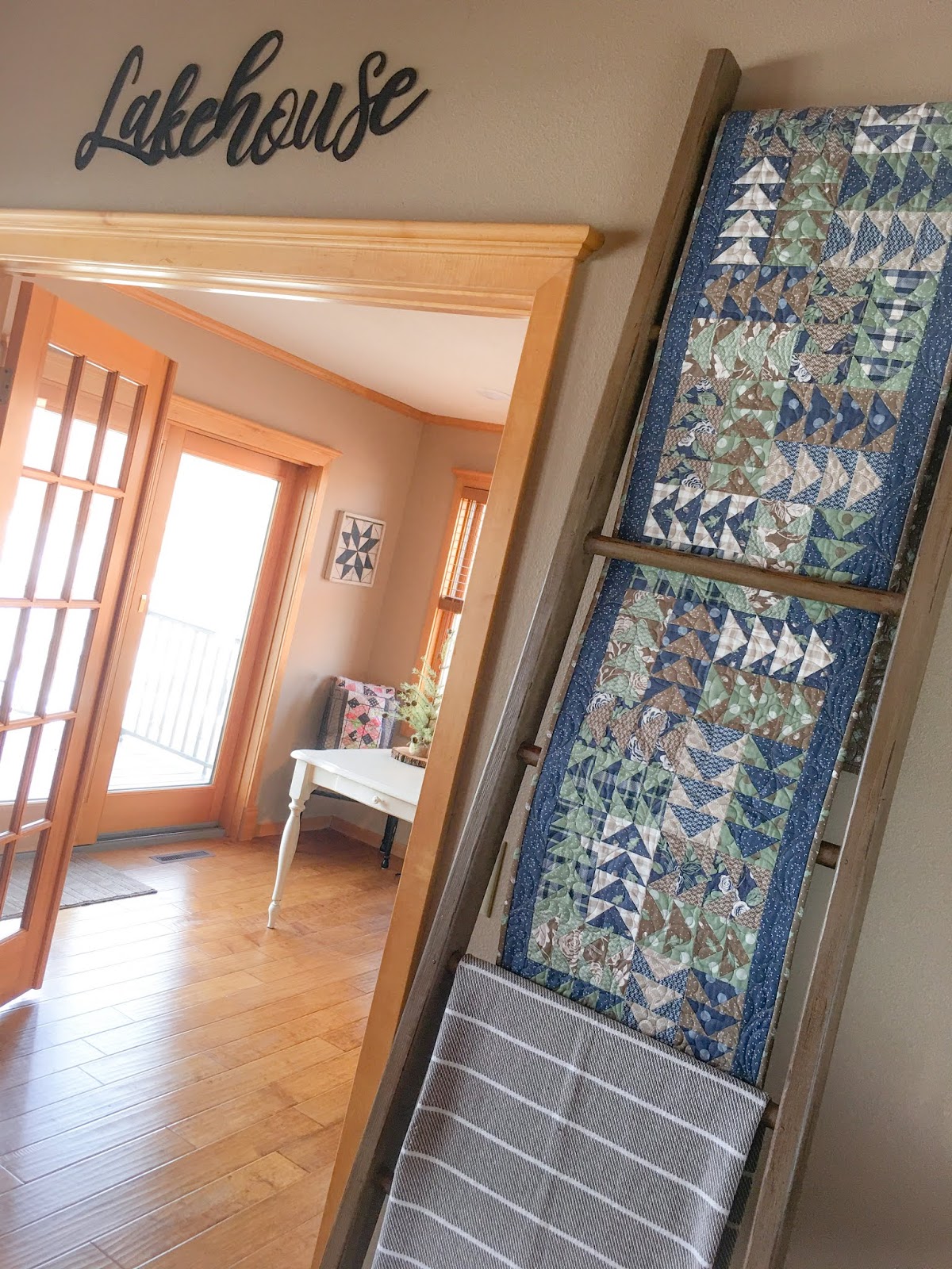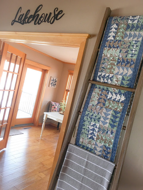 Hello quilting friends! I'm excited to update you on a project I started last year, a long Flying Geese runner featuring one of my favorite fabric collections, Harvest Road by Lella Boutique for Moda. The runner is finished, and I've displayed it on a quilt ladder in my living room. I'm really happy with how it turned out!
