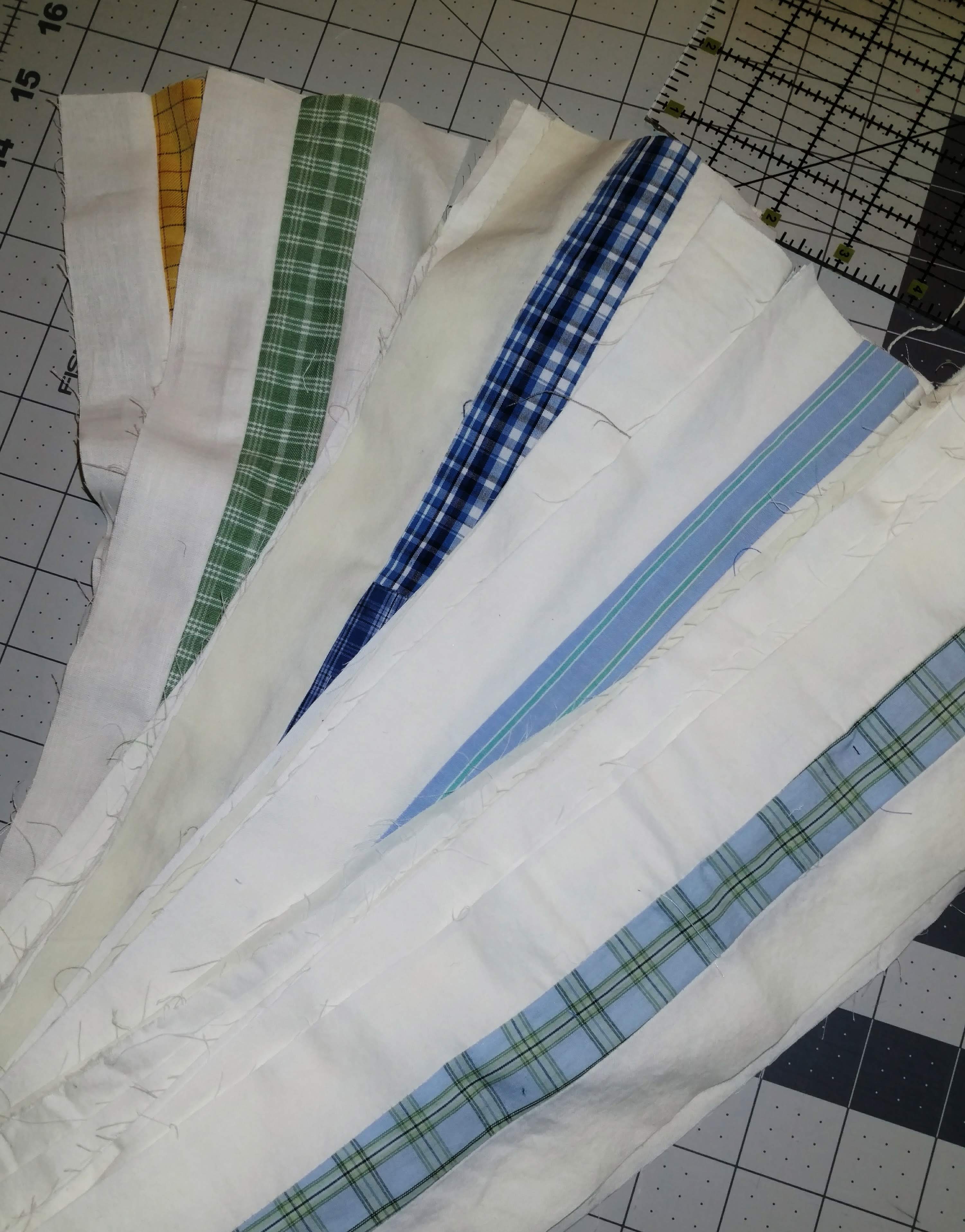 checkered past is finished. It is made using recycled shirt fabric from thrift store shirts. checkered past is a free pattern from quilted twins. There are only 16 blocks which doesn't sound like very many, but there 48 squares around each center. that's 960 squares. The block is 16 1/2.
