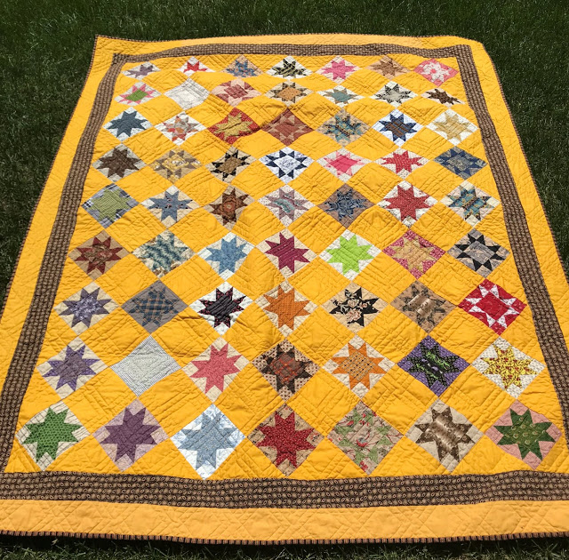 UFOs have been getting finished here at a fast pace this January! The cheddar/black fall quilt has its solid black borders attached, and is ready for the long arm quilter. Here is a picture of it: