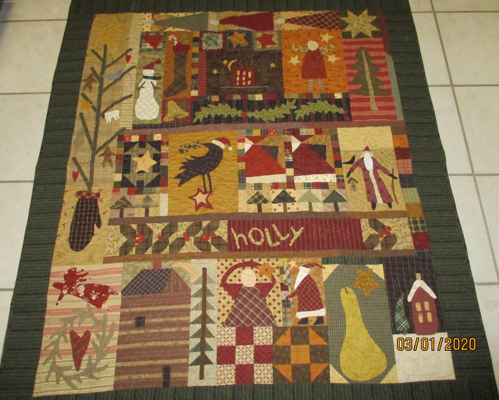 I finished binding two quilts.  The first is the Christmas Sampler which is a pattern done by Cheri.  I finished the top in 2010 so ten years waiting for machine quilting and binding.  I have to lay bigger quilts on my kitchen floor for a picture so not the best angle.  I enjoyed making the blocks.  Plenty of variety to keep my interest going.