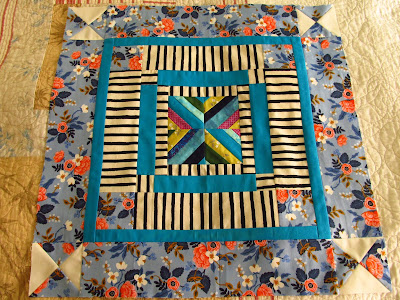 2 blue, 2 red medallion blocks, Maybe a final border with the b/w striped fabric? |