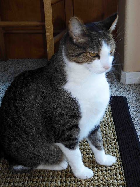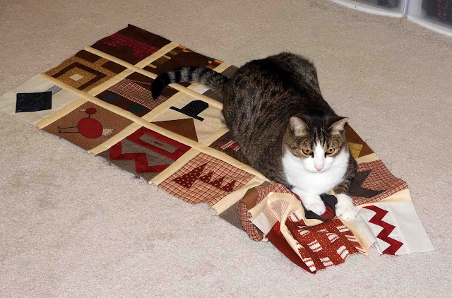It was a full day of quilting, and I had a lot of help from my kitty friends. There was a break after every go-round of the quilt, and so I would estimate that quilting and breaks were about equal in time. Kitties are excellent timers in this regard. When they demand treats, it's a good time for a break.