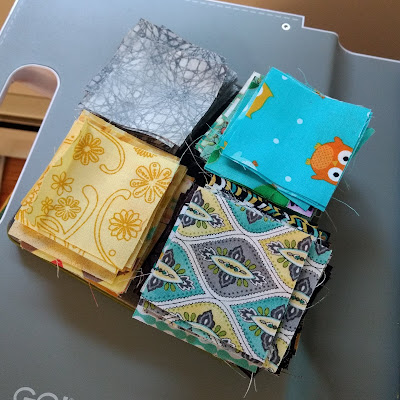 In the month of December, I was using my Jingle Bell Square blocks and block parts as leaders-and-enders for my Frolic unit sewing and my "I only have 15 minutes to sew" project. Now that it is the new year, I decided to pack up this project temporarily to clean up my sewing space slightly.