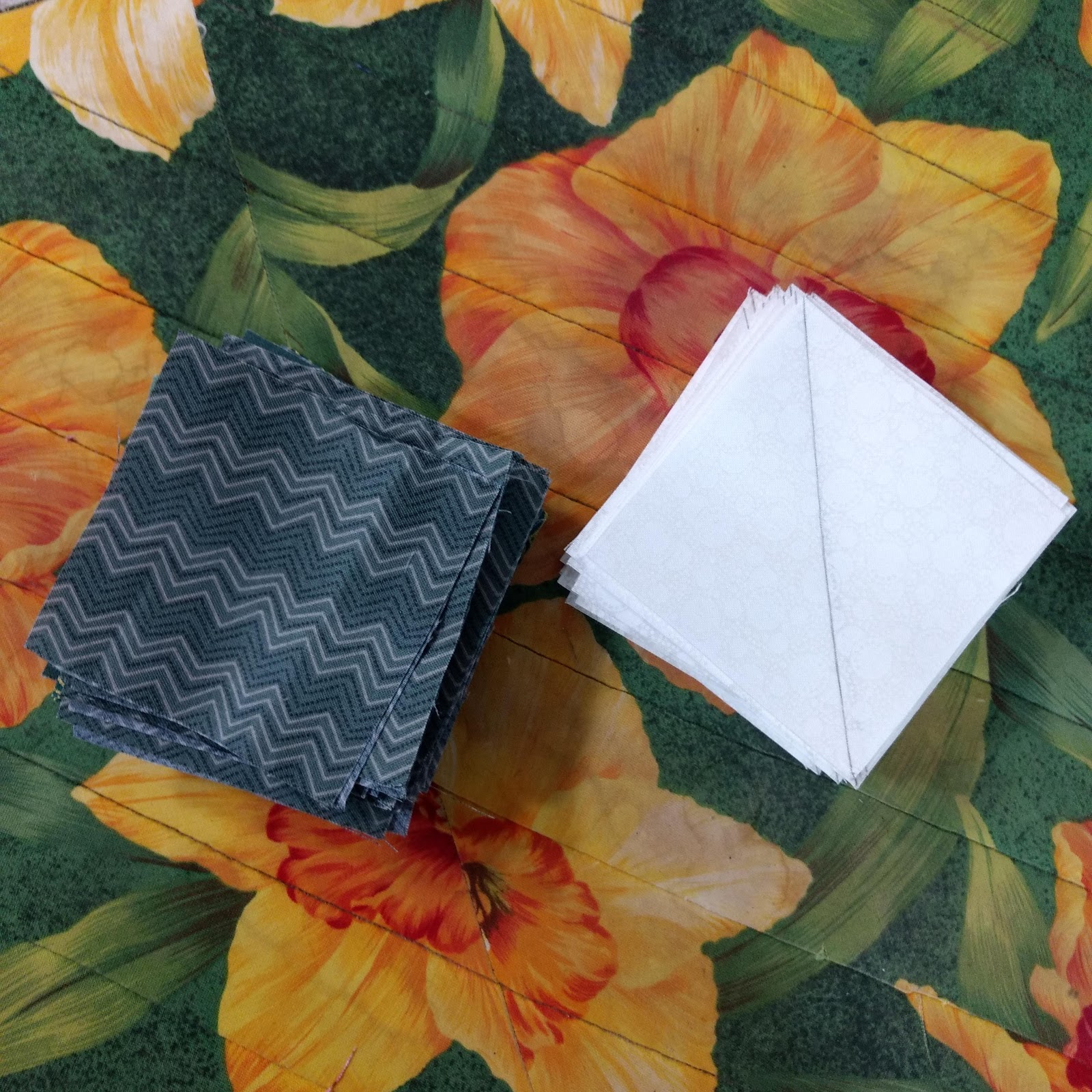 When I did the cutting for Clue #2, I did the cutting for Clue #3 as well. Thanks to weekend movie watching, I had all of the diagonals drawn on my background fabric squares in short order.