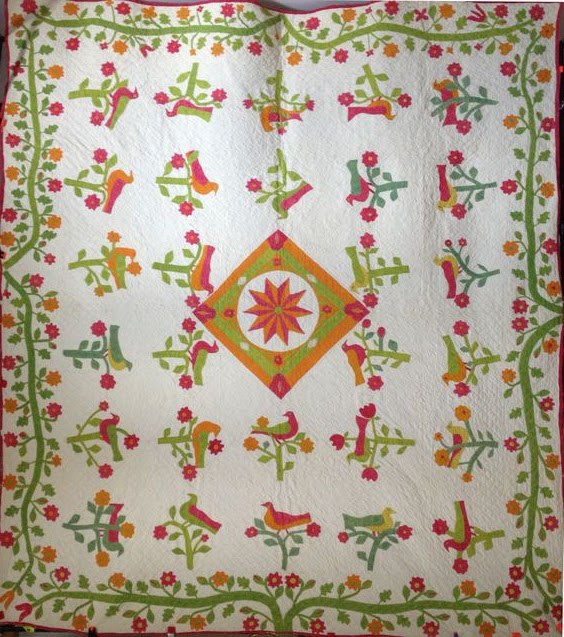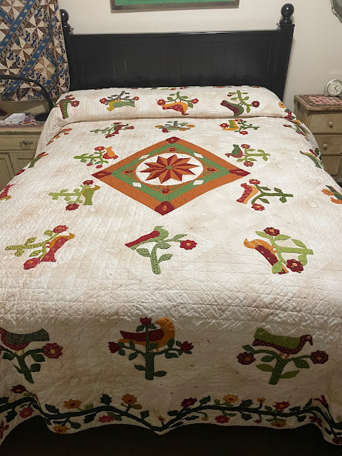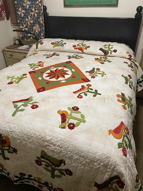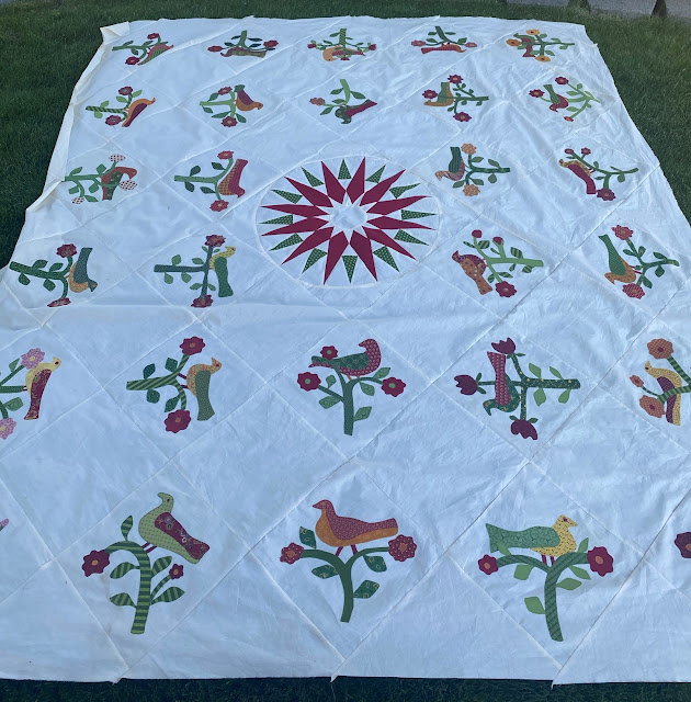It is huge (102"x116") and brought the stand and quilt to our empty store so I could photograph it. I struggled with the lighting but hope you can click on to enlarge.