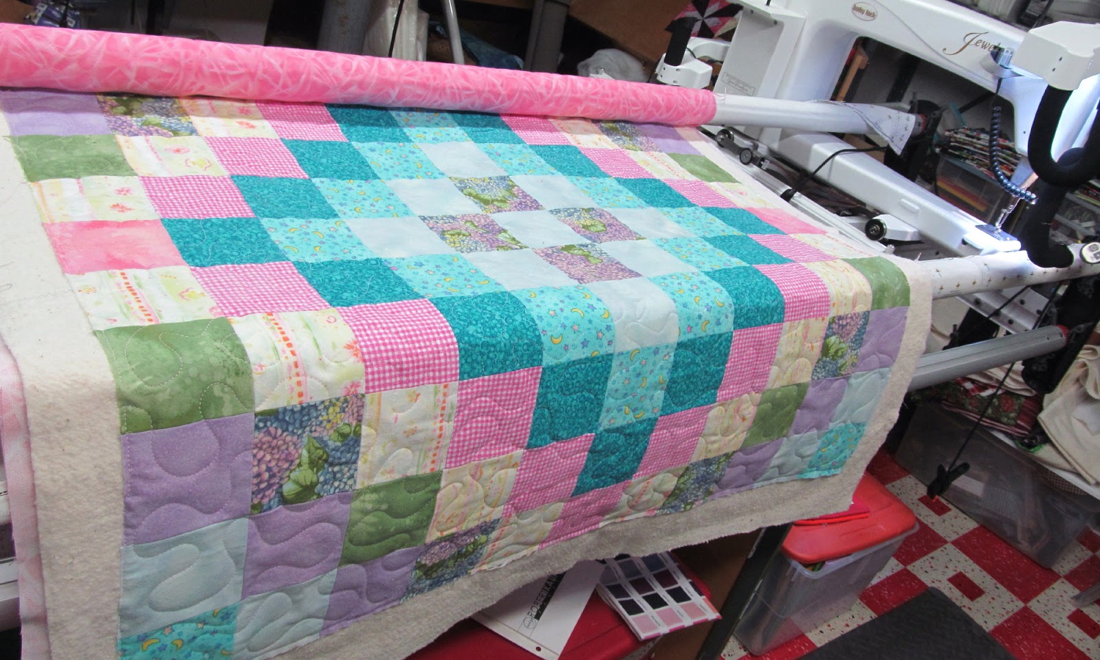 I loaded this quilt on the longarm on Tuesday but I didn't change the needle until yesterday morning. I quilted it shortly after lunch. I didn't even have this one on my 'to quilt' list. A friend pieced the top and left it with me along with her flannel scraps when she moved away. I had it tucked into the garment bag with other small projects and when I spied it I thought it would be a great 3rd finish for this month.