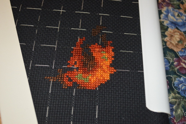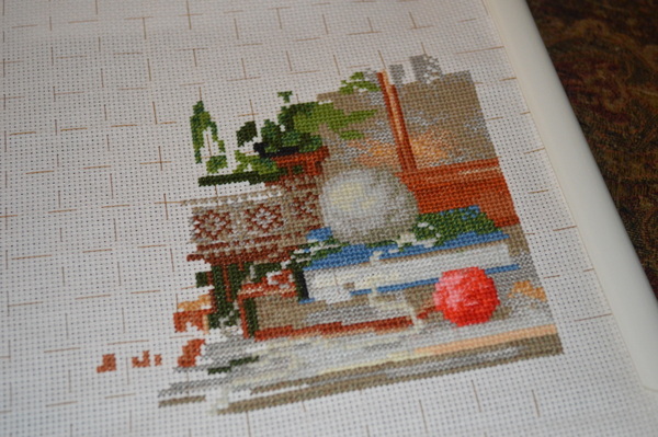 My best guess would be that it's a detail of the tablecloth. I could be completely wrong and I'm not going to spend any time worrying about it. It's completely possible to follow a chart and have no idea what that thing you're stitching actually is. I did that with the crochet hook and doily on Crocuses in the Windowsill. It's clear if you look at the picture on the packaging, but once I start to stitch I get focused on the chart itself.