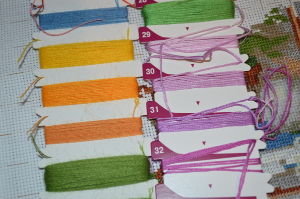 This is the first Riolis kit I've done that combines the fuzzy wool/acrylic thread with cotton six stranded floss. I wasn't expecting that until I switched to the purple colors and realized that something was different...