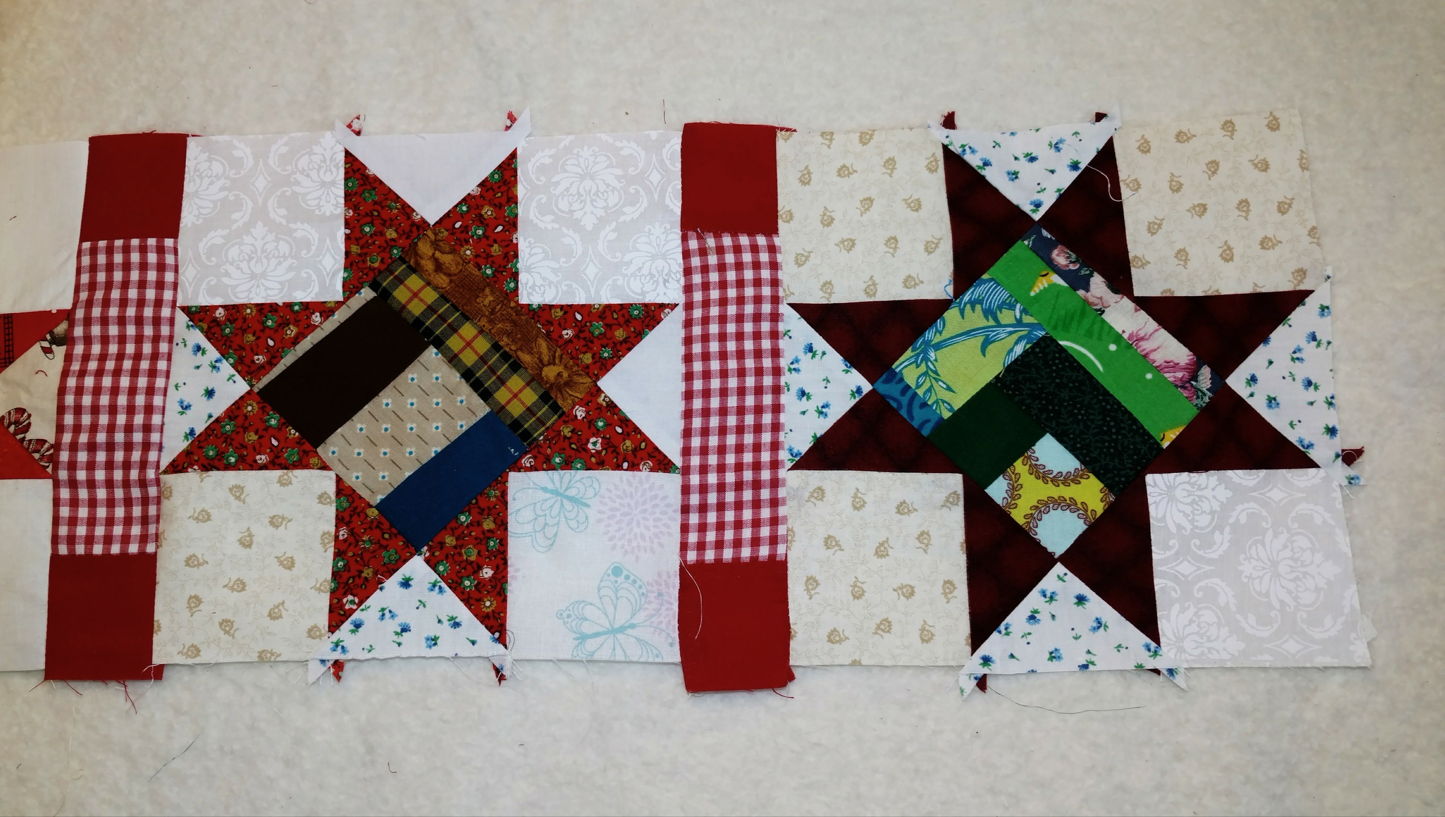 I wanted to see at least a few sewn together. Not all the blocks are exactly the same size ( how did that happen haha) .I have to do a bit of stretching or easing. Most of the pieces are on the bias, so, I can.