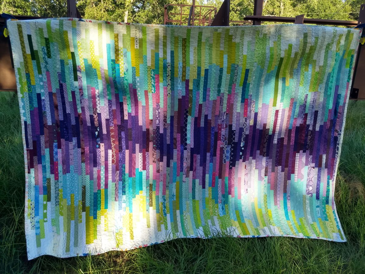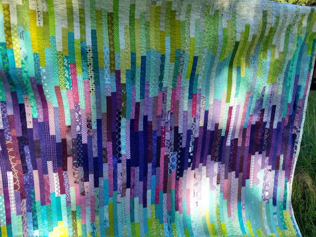 Everyone made about (8) 1" wide strips joined into a panel and these were joined into the quilt top by Briawna. Ultimately life happened and the top didn't get quilted, so Pam was kind enough to finish that step ...