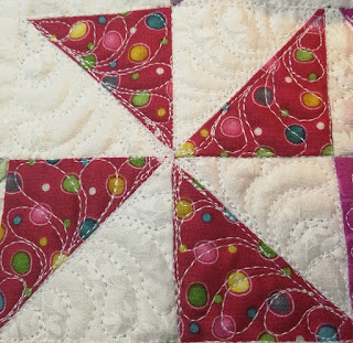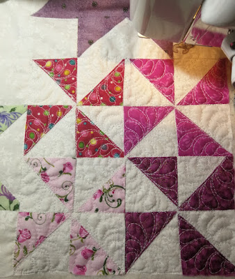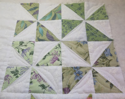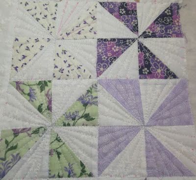 Here are the final three pinwheel blocks. I didn't realise until I added the images here that all three blocks have FMQ in both the background and patterned fabrics.