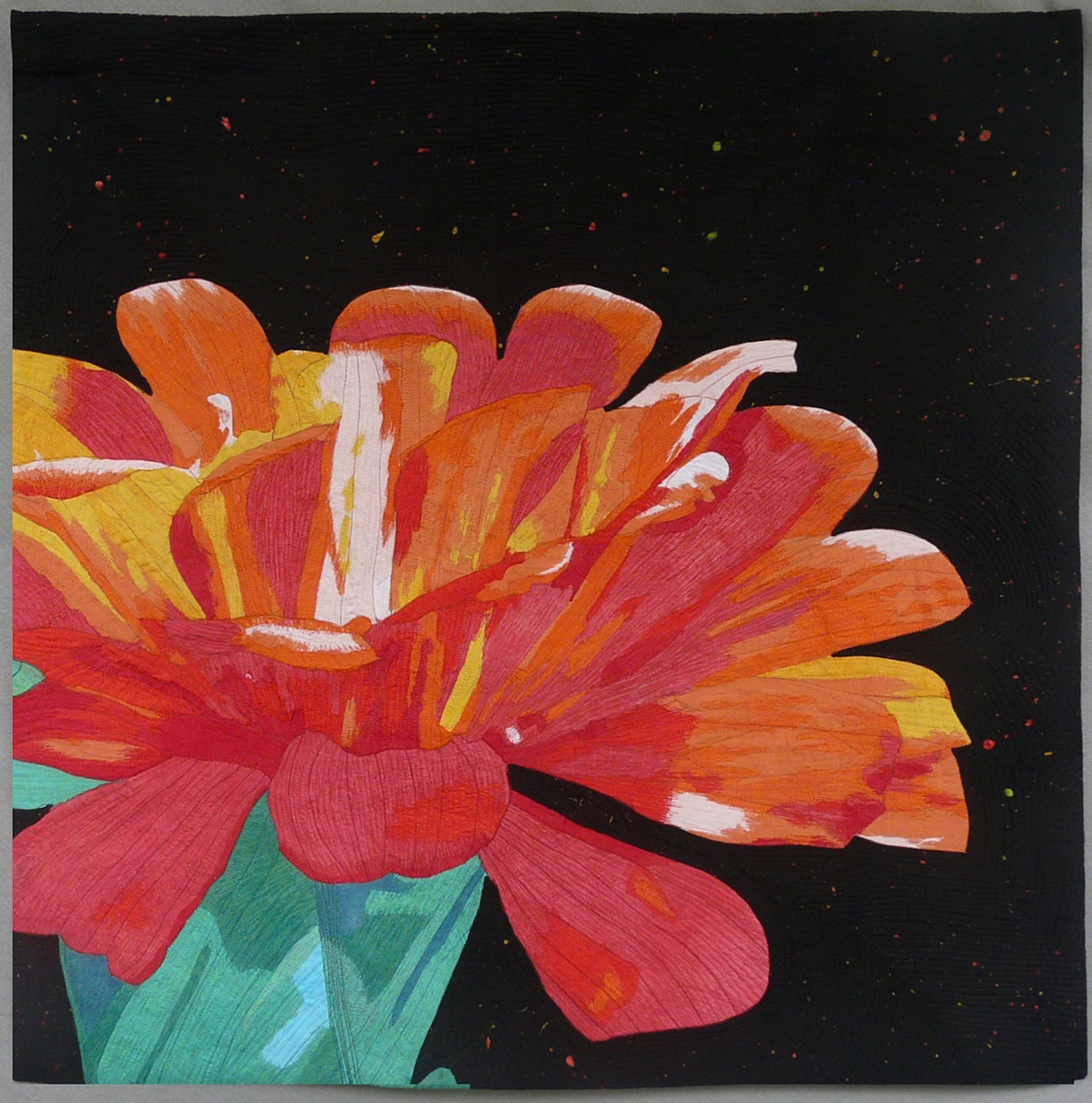 36 x 36"Hand dyed (by artist) cotton sateen, hand painted commercial black fabric, cotton thread