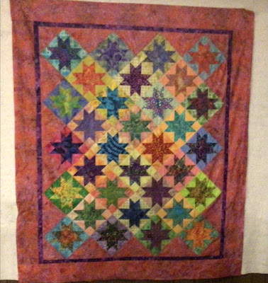 The batik variable stars are now a flimsy. I made 36 blocks and used 32 of them. It may not look like it, but there is a color arrangement -- warm backgrounds in the center and cooler backgrounds around the perimeter. (The four blocks I did not use were ...