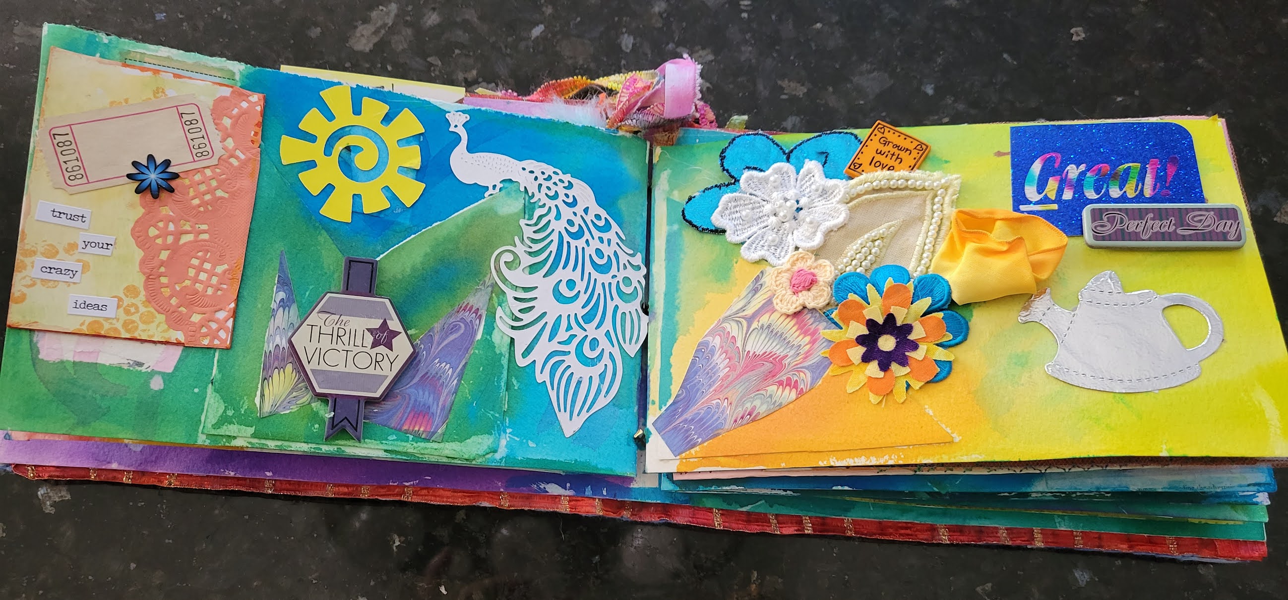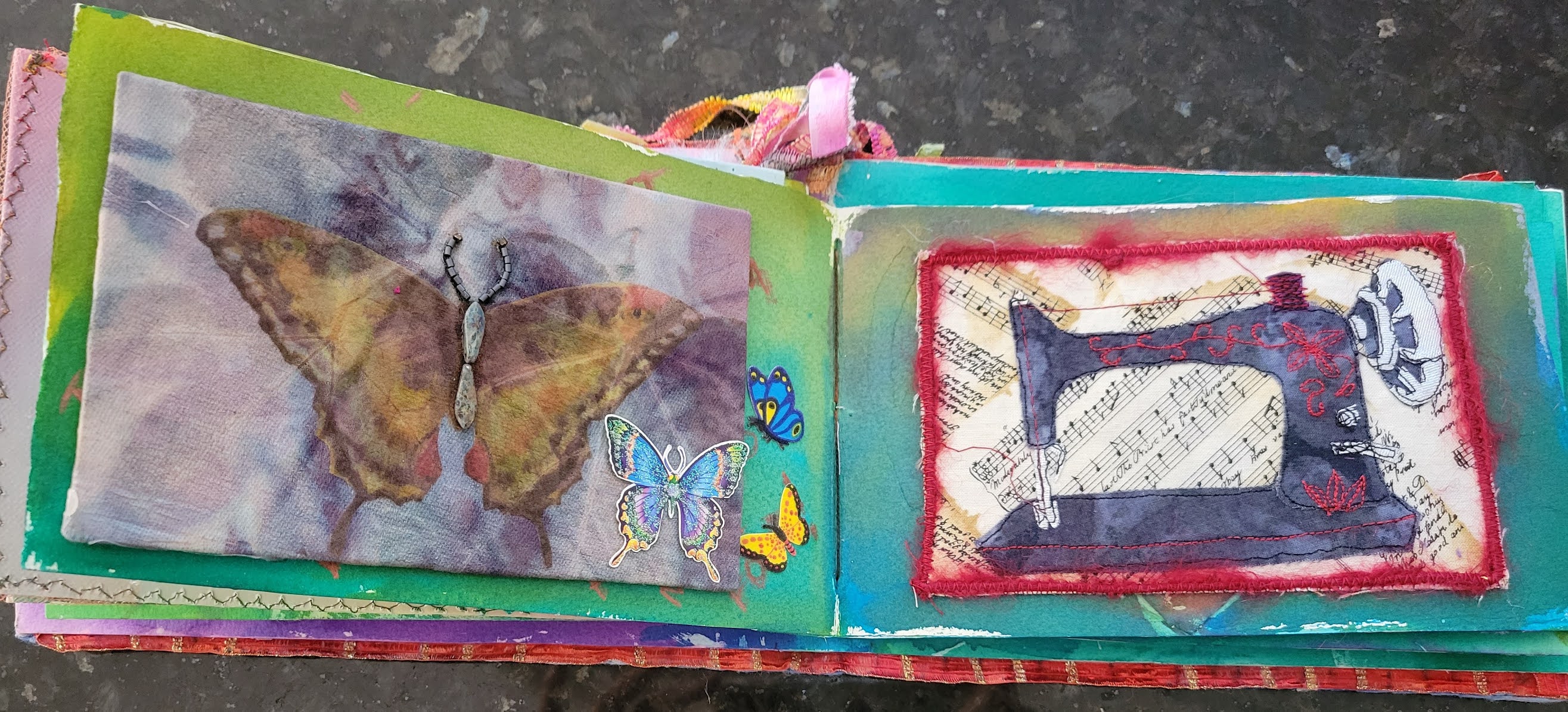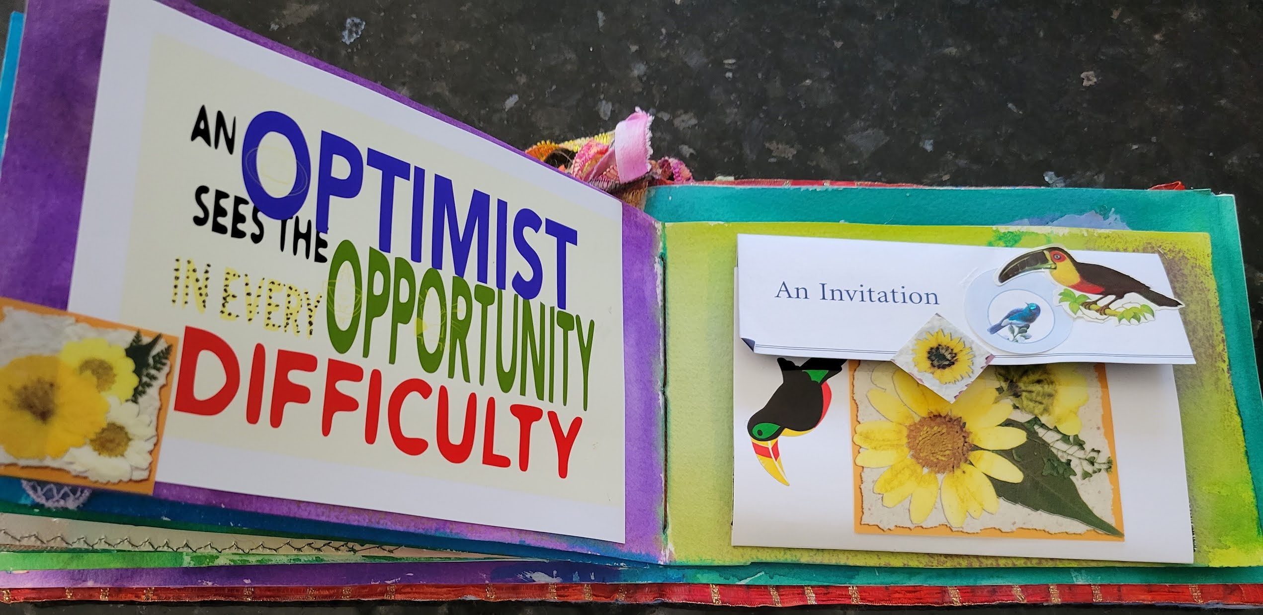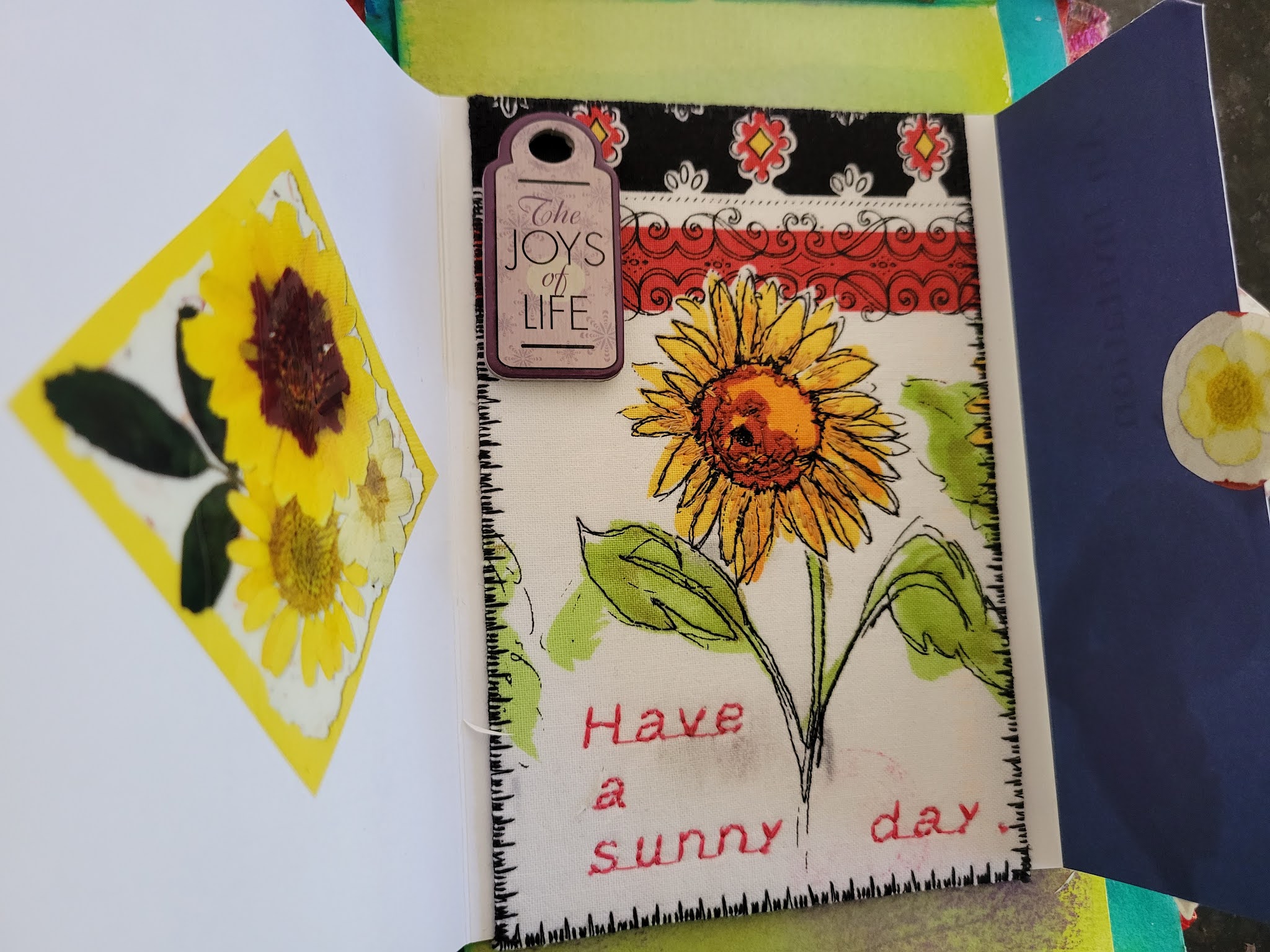 One end overlaps the other. Three metallic buttons seal the flap, and I put more buttons below the top edge. The view shifts as you turn it...Contents include:
