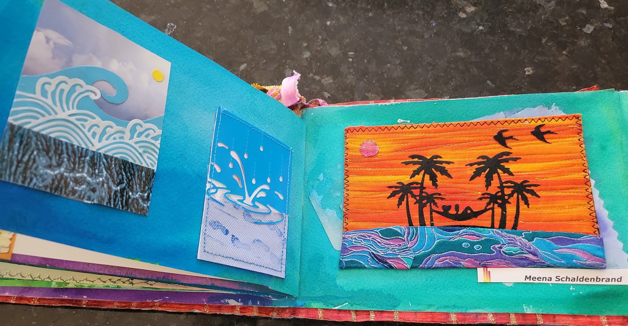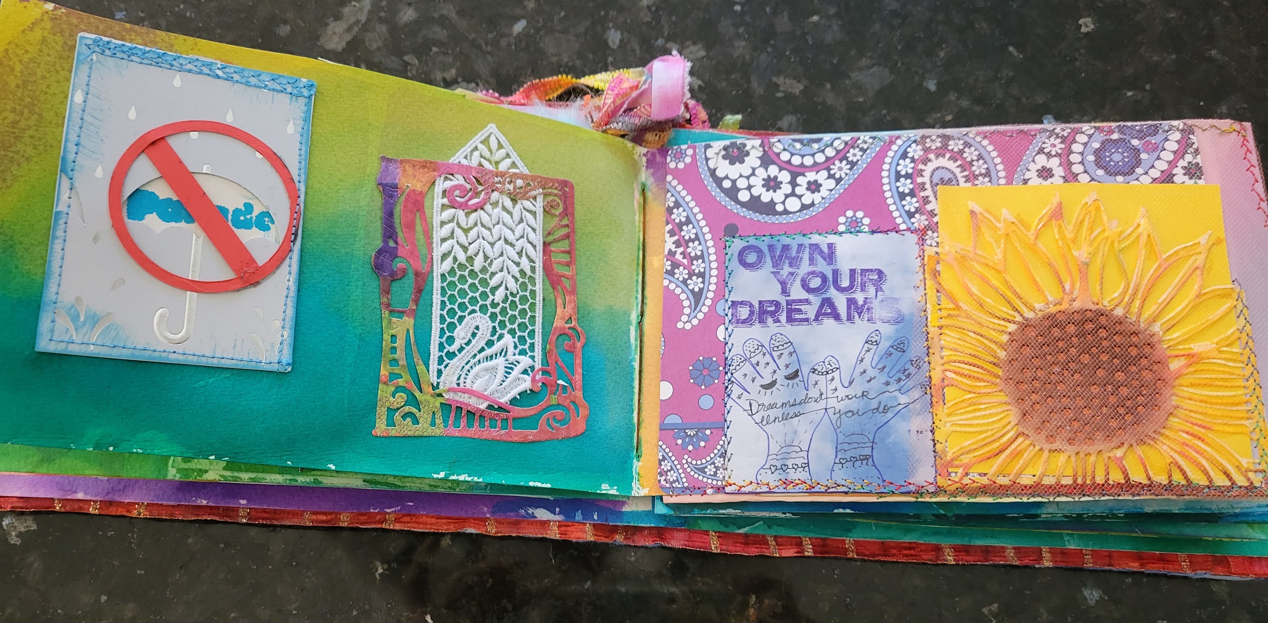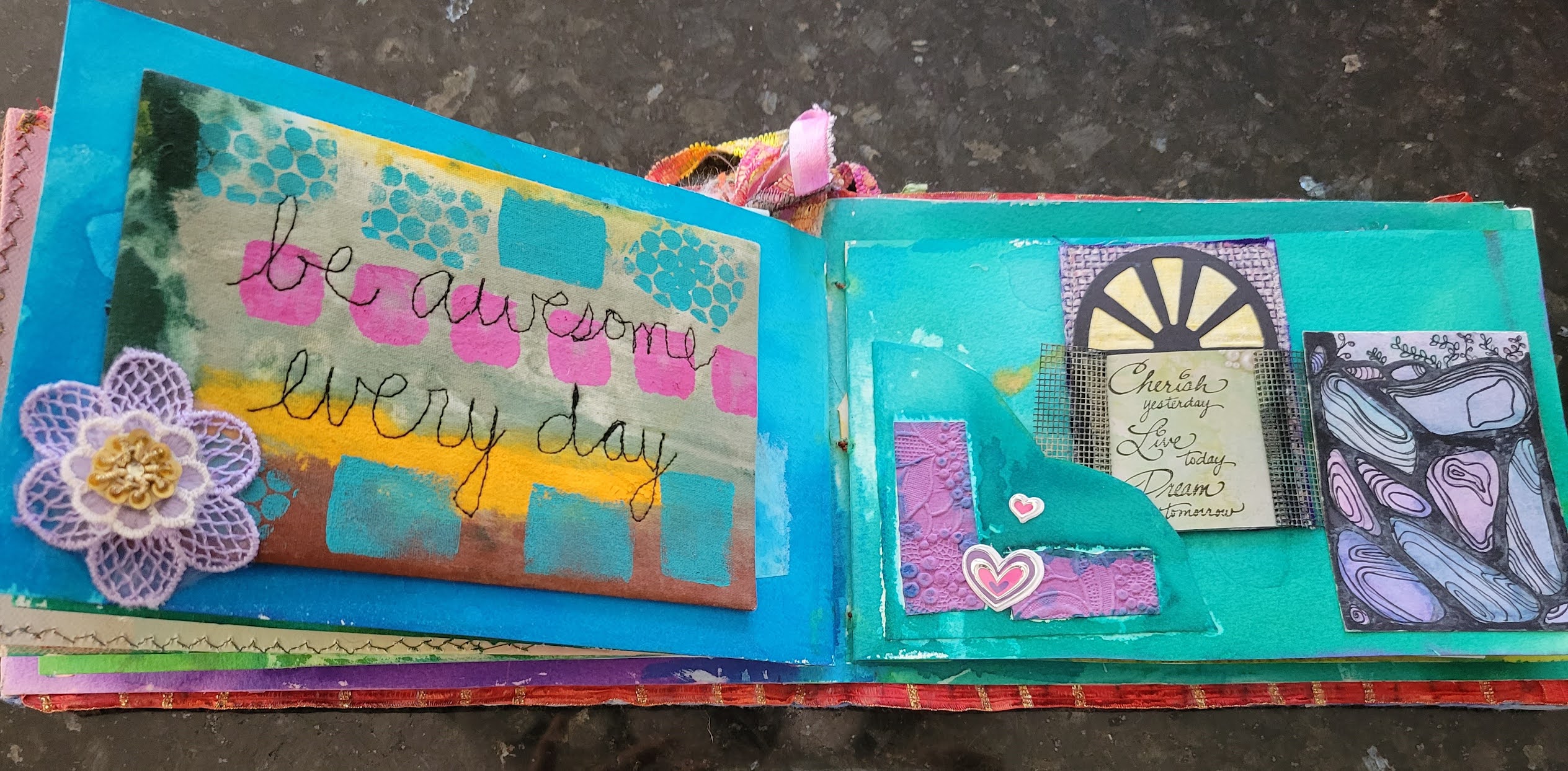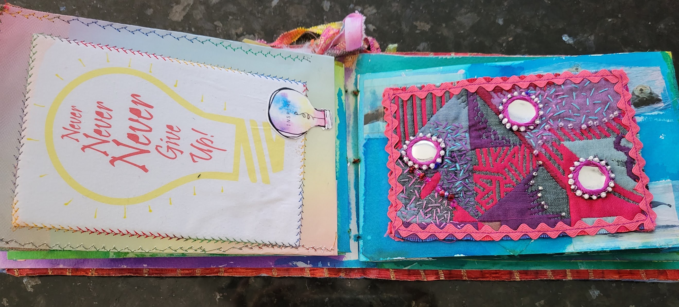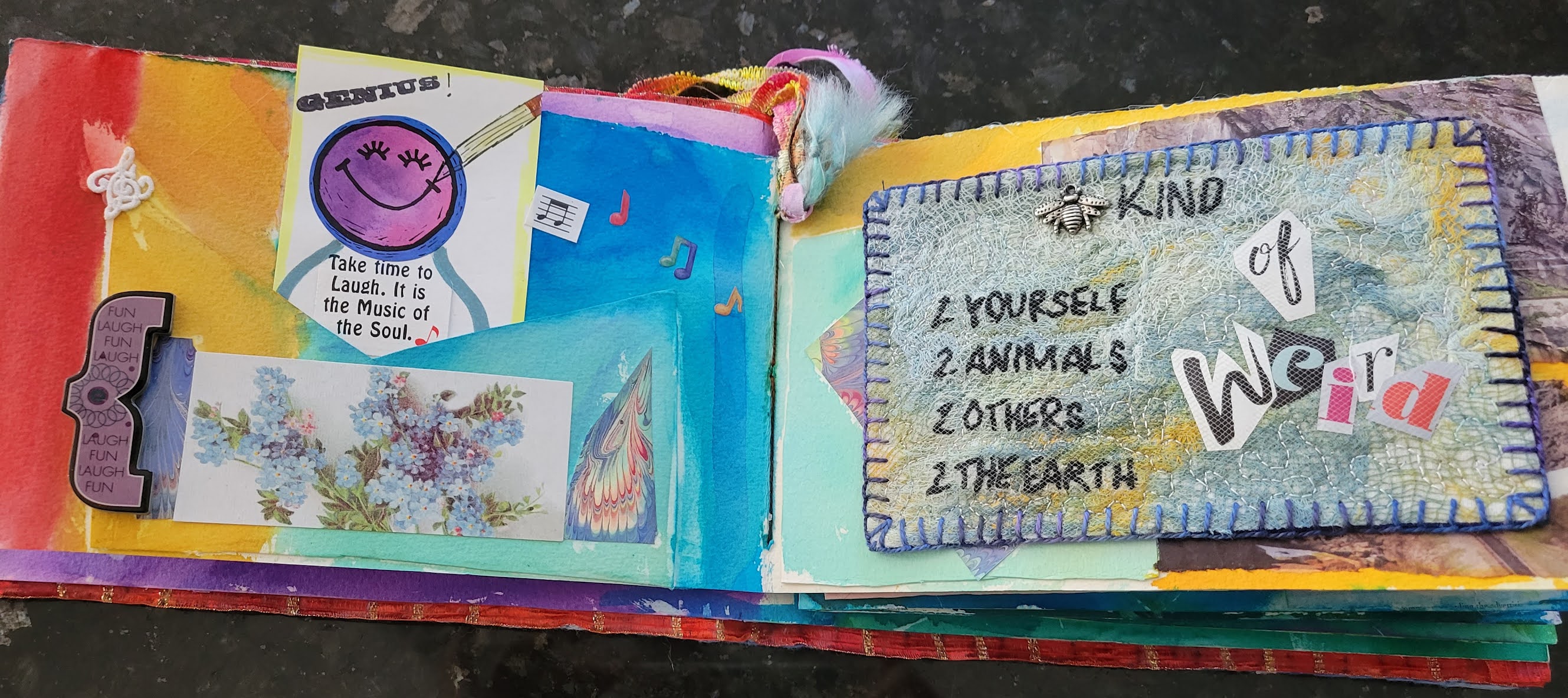 One end overlaps the other. Three metallic buttons seal the flap, and I put more buttons below the top edge. The view shifts as you turn it...Contents include: