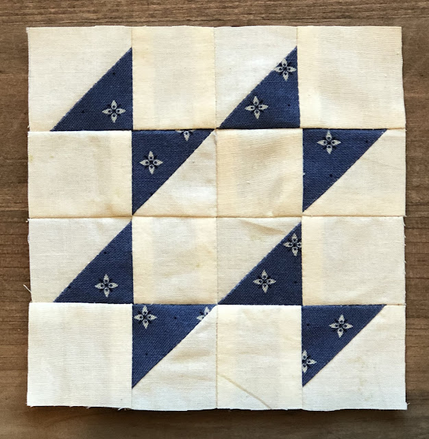 Sew four rows together to make one block measuring 4 1/2" square. Repeat to make a total of (8) blocks. Done for the week! We're in the home stretch now.