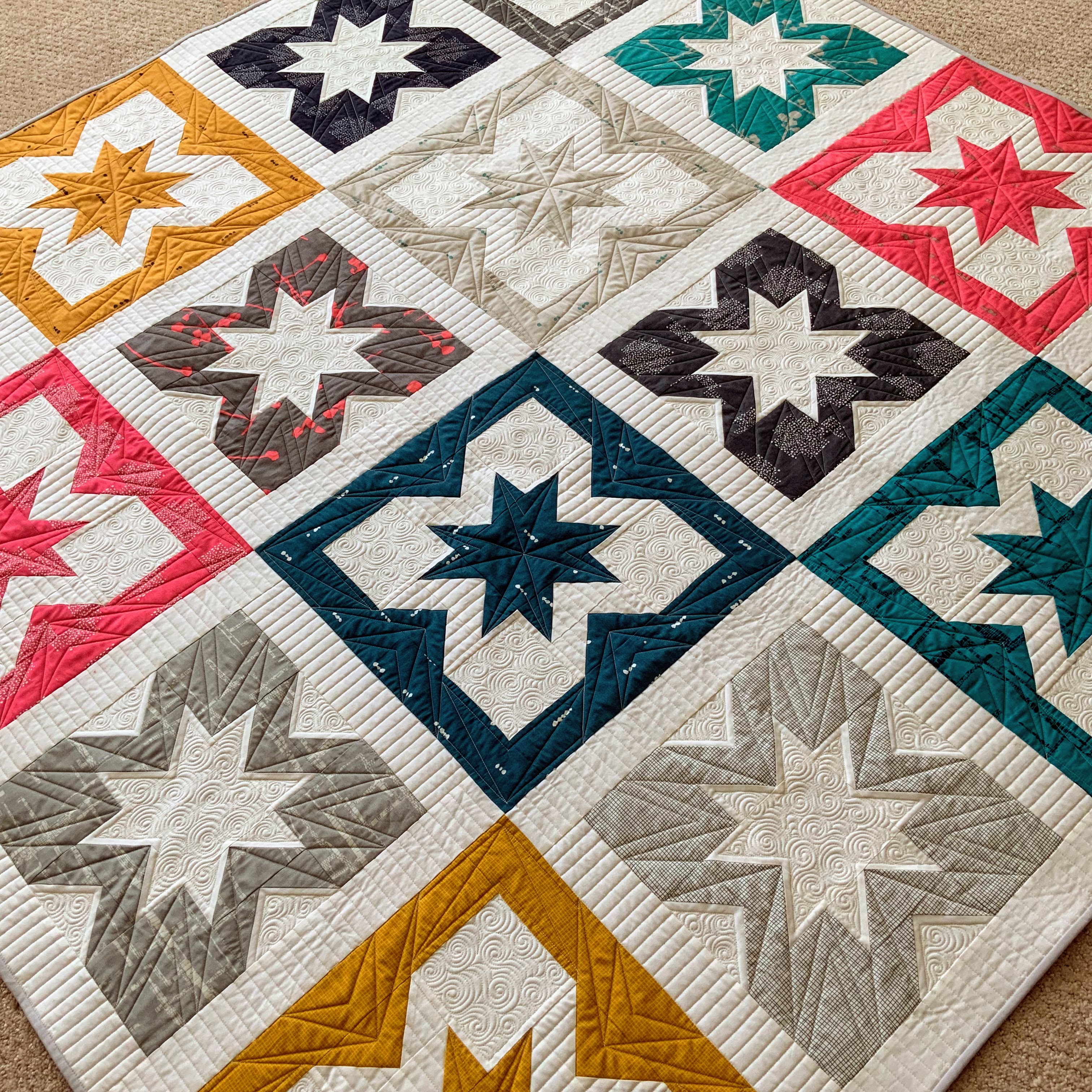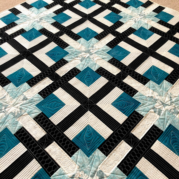 I'm not sure what this pattern is actually called, as the pattern itself didn't say. I decided to name it Go Kites because these blocks are kind of kite blocks. The fabric used is Basic Mixologie by Studio M. The pattern uses a specialty ruler, but I used my preferred method of ... read moreFacets is one of my favorite quilt-tops from last year, so I didn't expect to quilt it so soon, but when I looked through my queue to decide which quilt to quilt next, it jumped out at me, begging to be quilted. Well, I can't resist that when it happens!