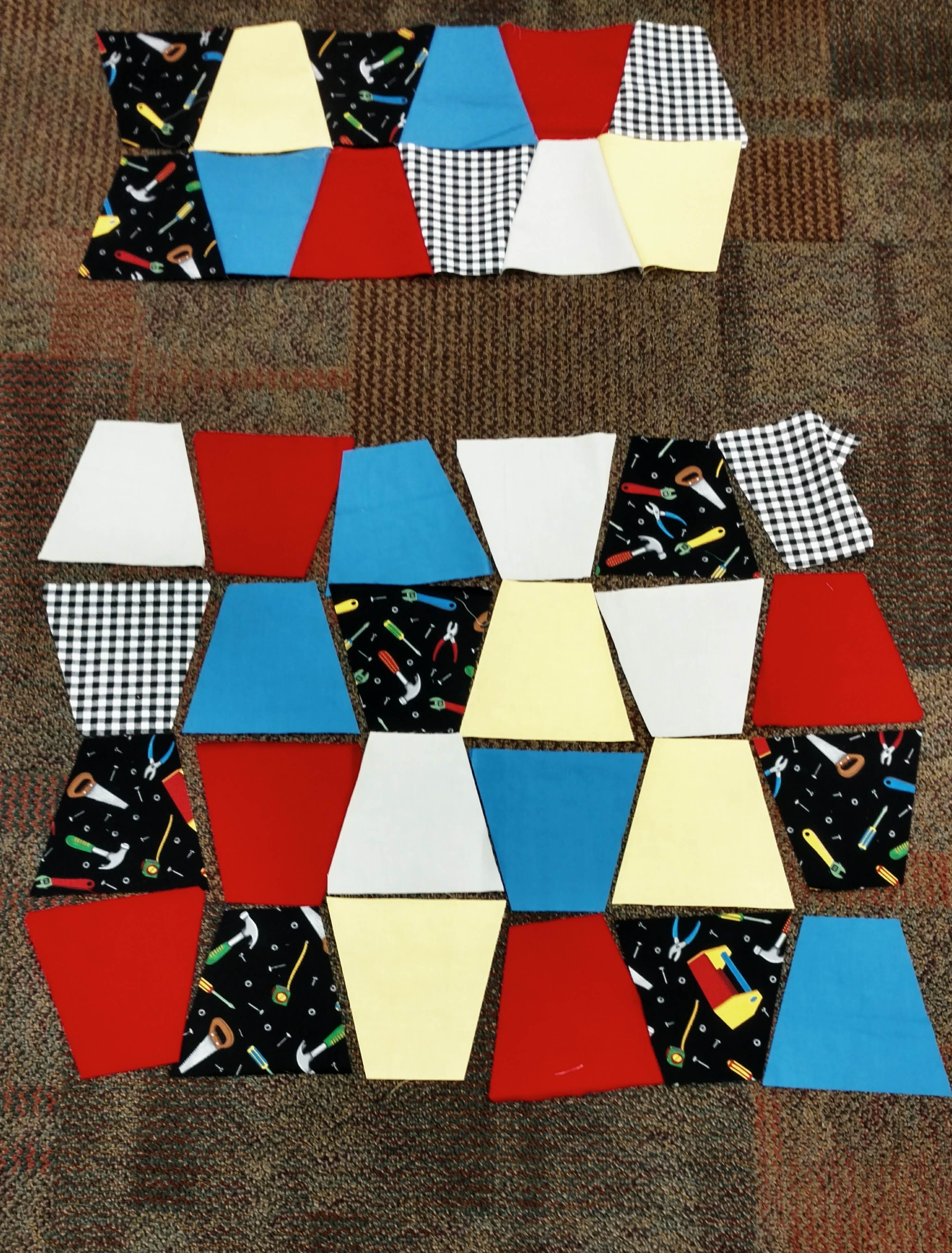 Our guild met on Saturday to sew quilts for charity. We donate to the police department for trauma children and for healthy families and education. One of our members had her Florida guild do these large tumblers for their donation quilts and she wanted us to try them as well. We cut one Saturday and made kits. And this Saturday, we sewed the kits together for a quilt.