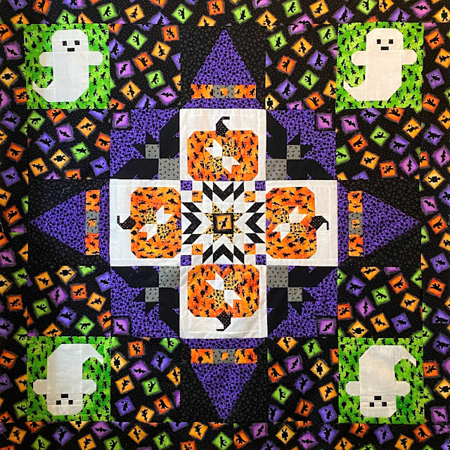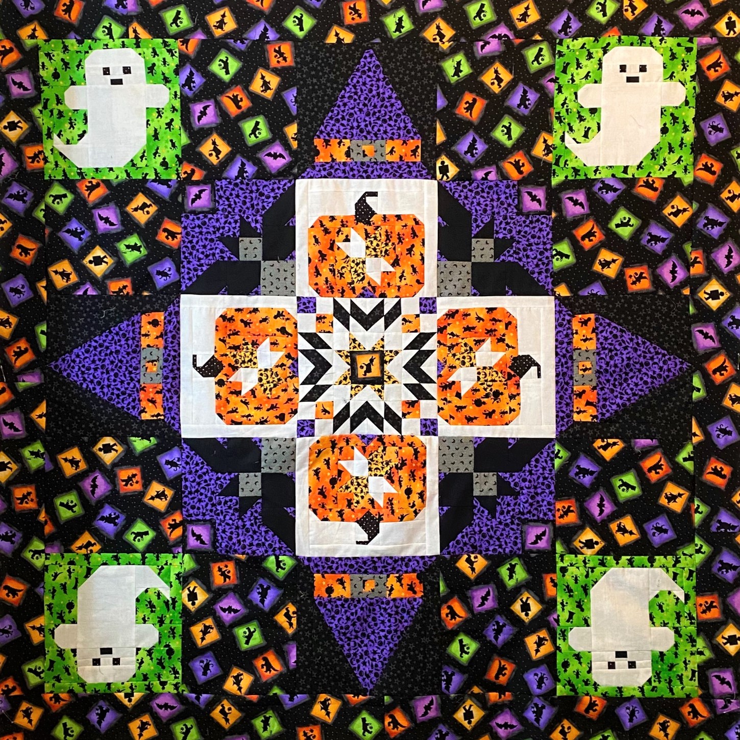 I wanted to make a block with a large purple triangle to add movement to my quilt and extend the purple from the bat blocks and the orange from the pumpkin blocks into the outer block border.