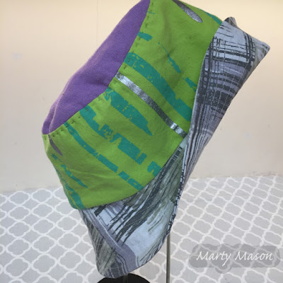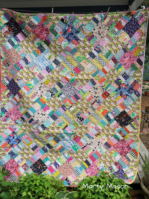 I only have a few batik scraps left so decided to reduce them a little bit more by making an Ohio Star quilt...AKA Sawtooth Star by some. It's a 4 block by 4 block construction simply because that's all the lighter batik background fabric there was in my stash. It's a good community service size - 48" x 48". Those stars made big are so easy and finished in no time by making the 2-at-a-time flying geese blocks for the star ...
