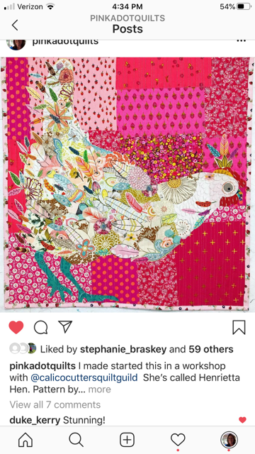 This is my challenge quilt, Henrietta Hen. Our theme was Farm Animals. I have no energy to go upstairs, find the quilt and take a picture so you are getting a screen shot (-: from Instagram.