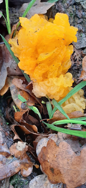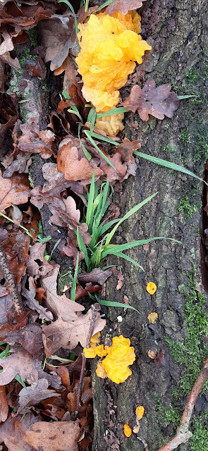 En ook vrij algemeen voorkomend in het hele land, maar ik had deze gele trilzwam ( Tremella mesenterica) nog nooit gezien.