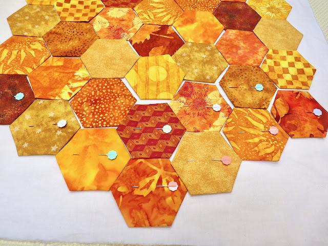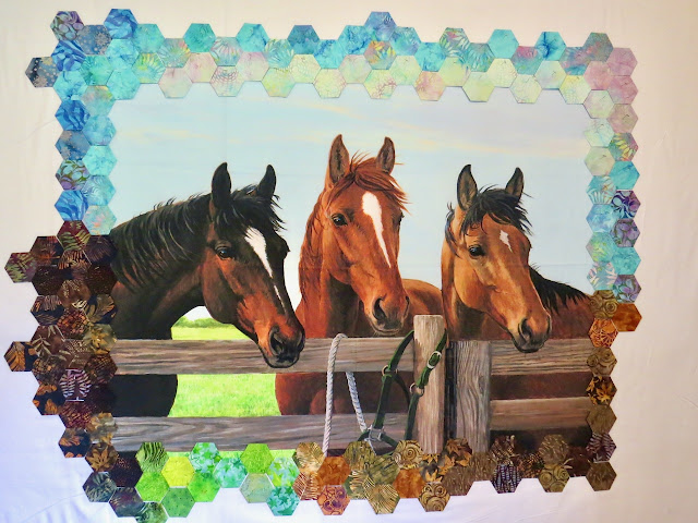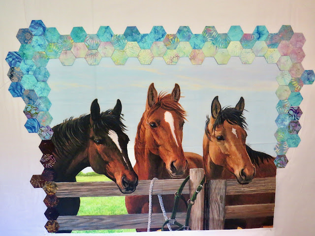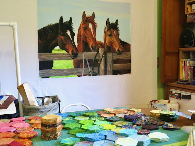 This panel measured 23 inches wide. I chose 5.5″ (Cut my strips 3.5″) finished hexies because 4 X 5.5 = 22″. Now I only have trim 1/2″ from both sides and my hexies will fit along the bottom and the top of the panel.