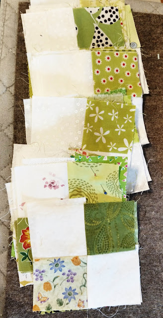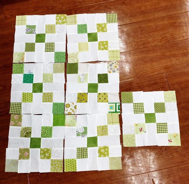 I made 8 of green. When I laid the squares out for the photo, one was missing in with another project, but, I found the sneaky little thing.