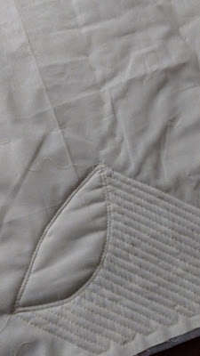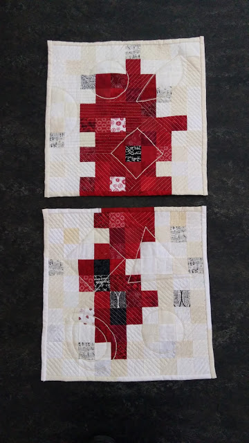 Bovenstaande twee mini quiltjes die ik een paar jaar geleden maakte heb ik dan ook in die kleuren gemaakt. Met alleen maar blokjes gemaakt maar juist heel anders door gequilt met schuine lijnen en losse vormen. Hier onder zie je een detail van de achterkant tijdens het quilten, op dat moment nog niet klaar.