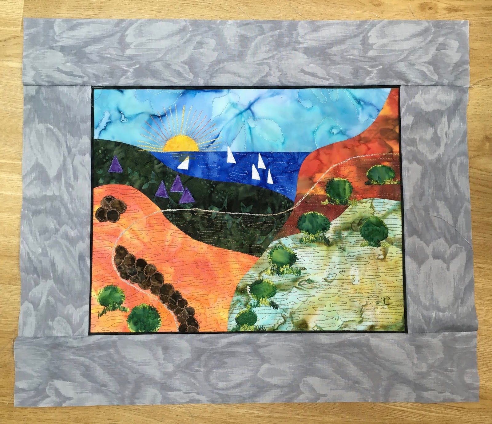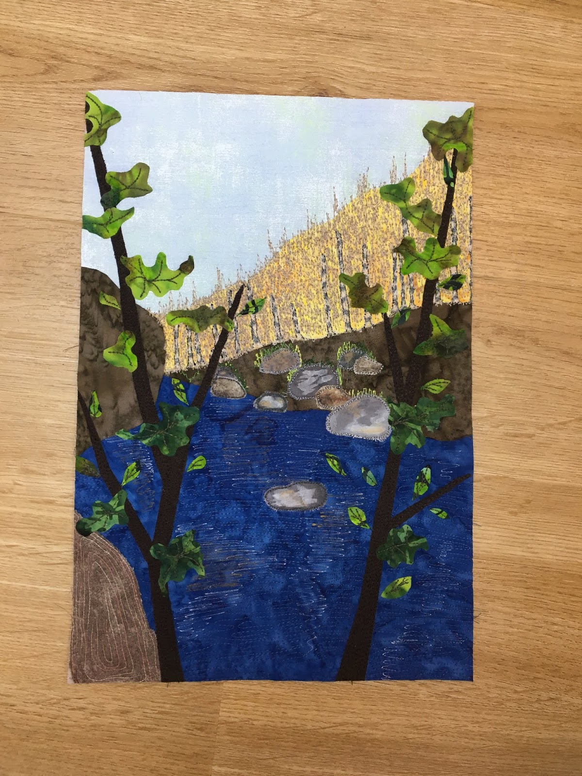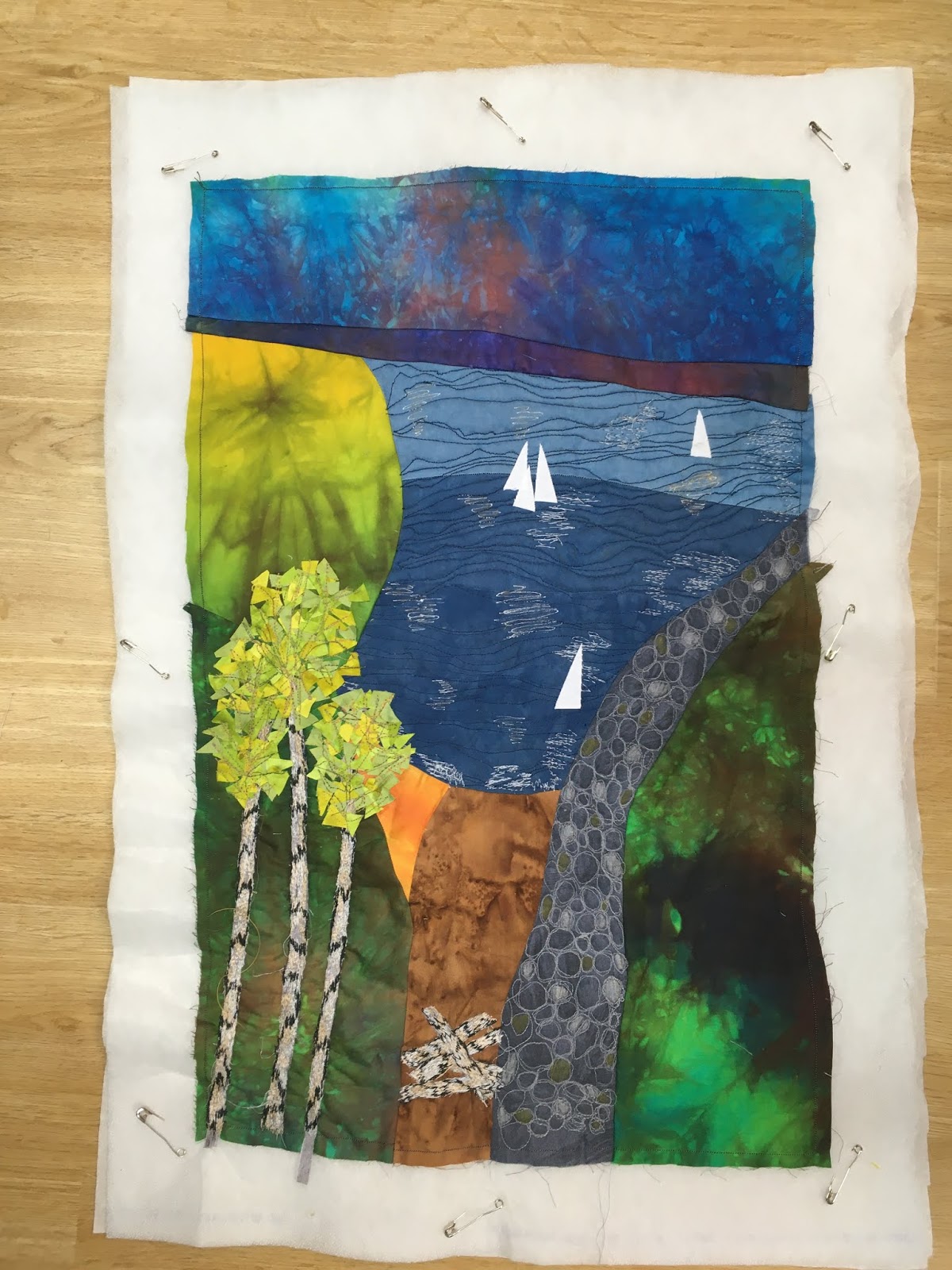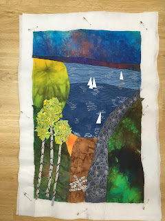 Es ging um eine Kombination aus Patchwork und Applizieren mit Maschine. Eine Applikationstechnik, die ich vorher noch nicht ausprobiert habe (Stärkeapplikation).