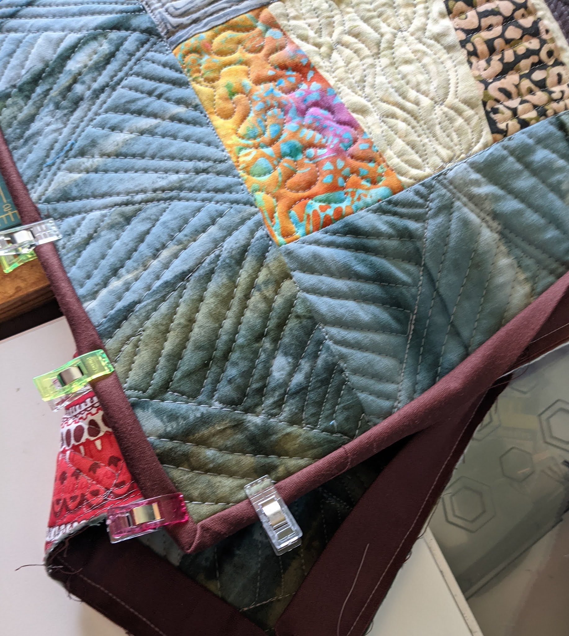 My "liberated quilting" table topper is complete. Because the top and the backing would need different thread colors for the binding, I chose to hand sew the binding to the back.
