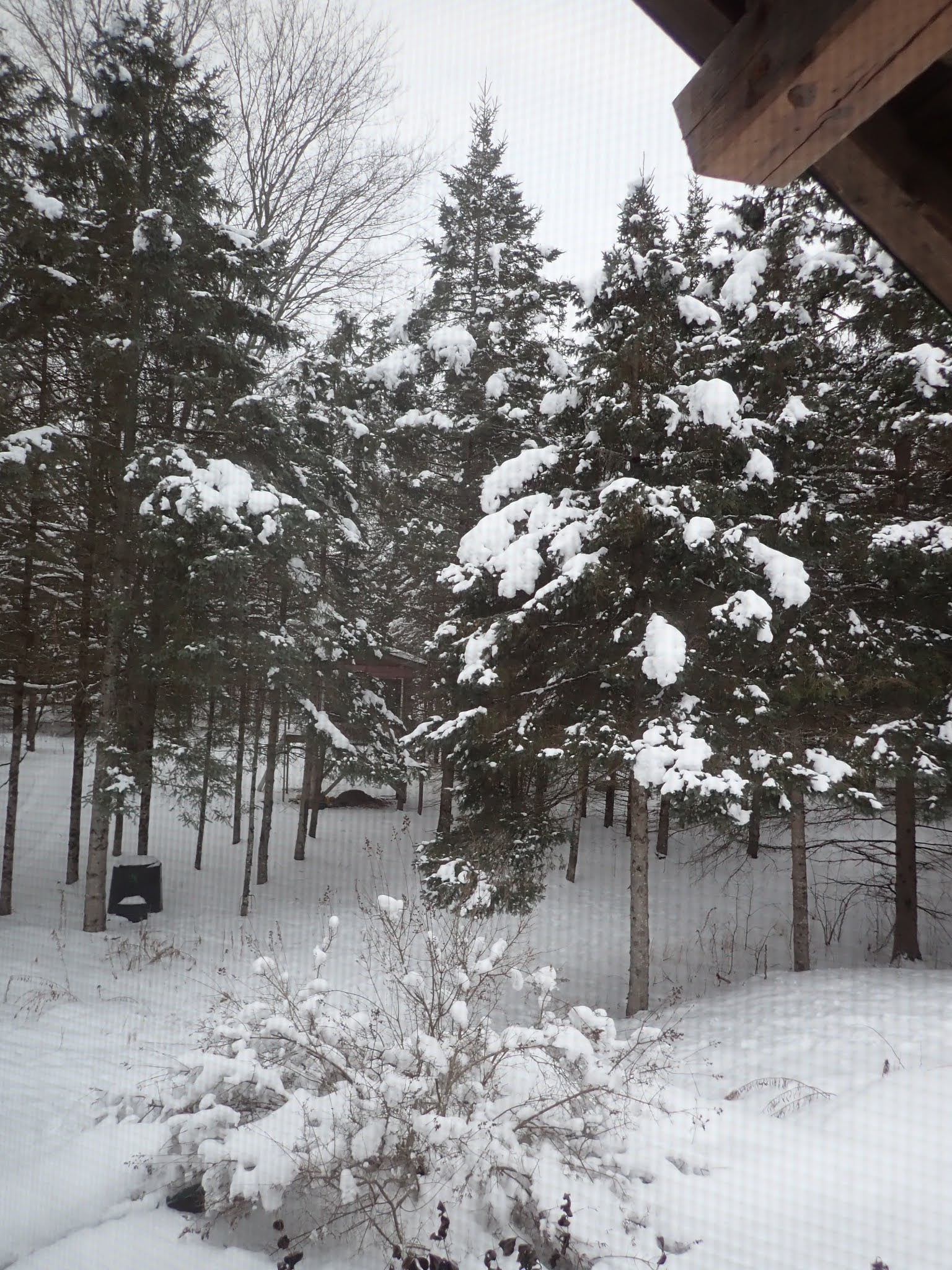 The black thing is my compost bin. Snow softly falling all morning.We've had a good week here at the wooden house or as SIL says "in the pines". Got in enough exercise to feel vindicated in treating ourselves to dessert and got our Christmas gift list in order to name a couple of things. The cut off for delivery to Canada was midweek so that stopped the dithering and we got our decisions made and everything ordered. Not that there is that much because our family circle is tiny.