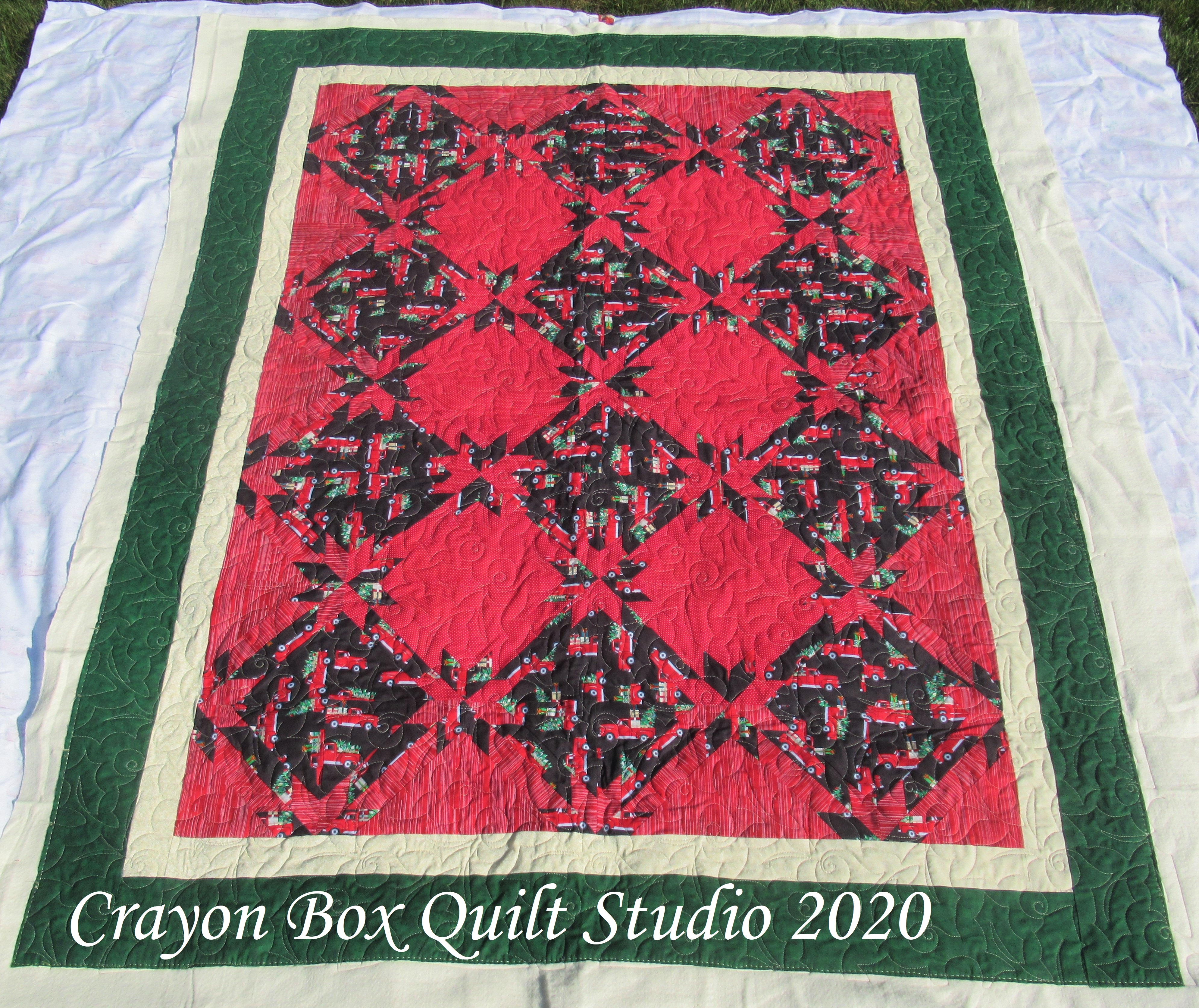 My friend Susan also made herself a Hunter's Star quilt featuring adorable vintage trucks.