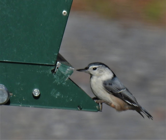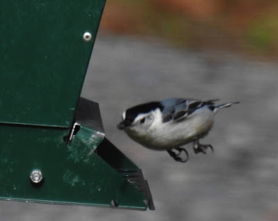 The days of rain ended with a light dusting of snow. Everything looking so white and clean. The feeders were very busy even during the rain. I took this shot of a nuthatch coming in for a landing. They, like the chickadees, seem to work so hard for their seeds.