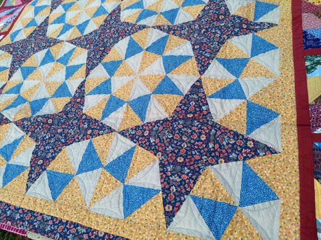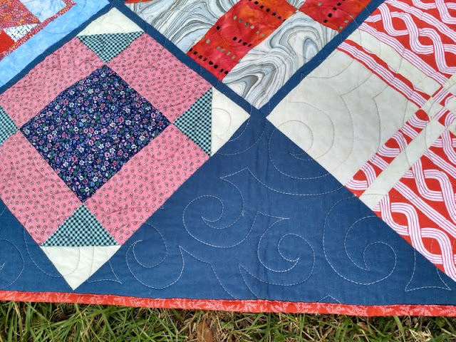 Only two quilts today, these were both quilted by Linda. I wanted to show some closeups of the quilting because it's brilliant. This beautiful batik top came from Christine B, it's butterfly themed. Look at the lower left corner where the sun is hitting to see the true colors of the border.