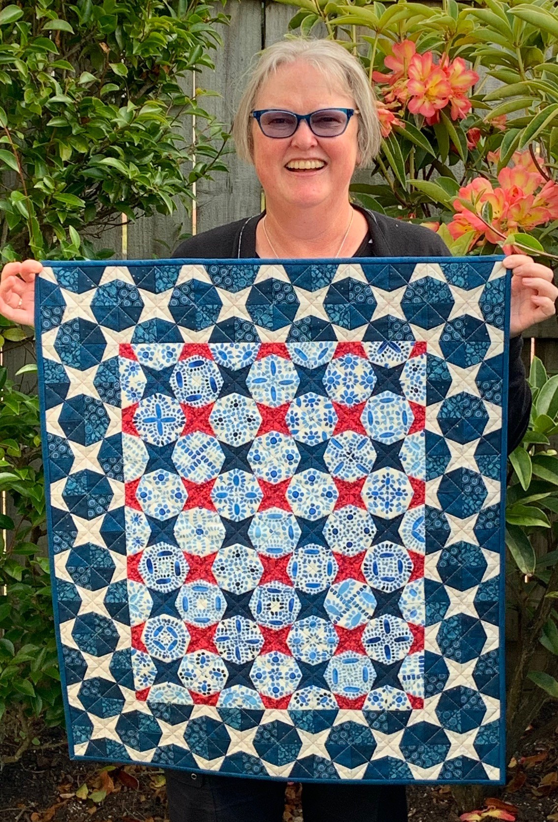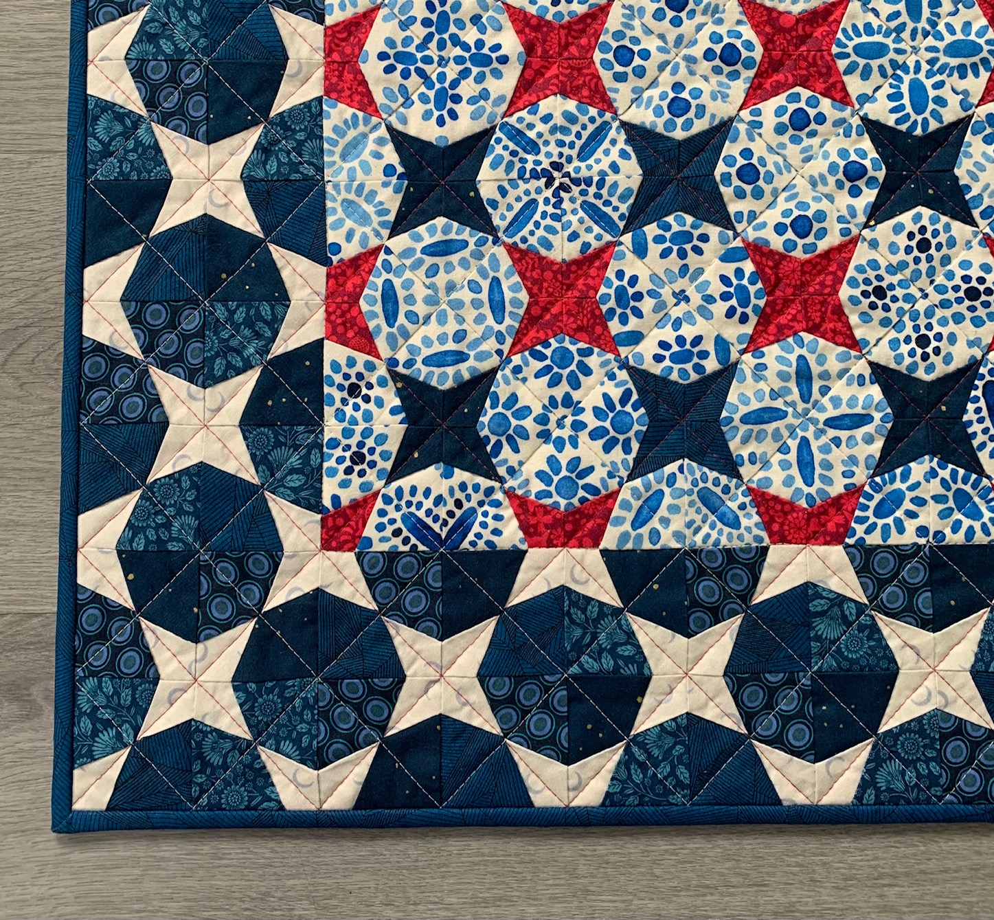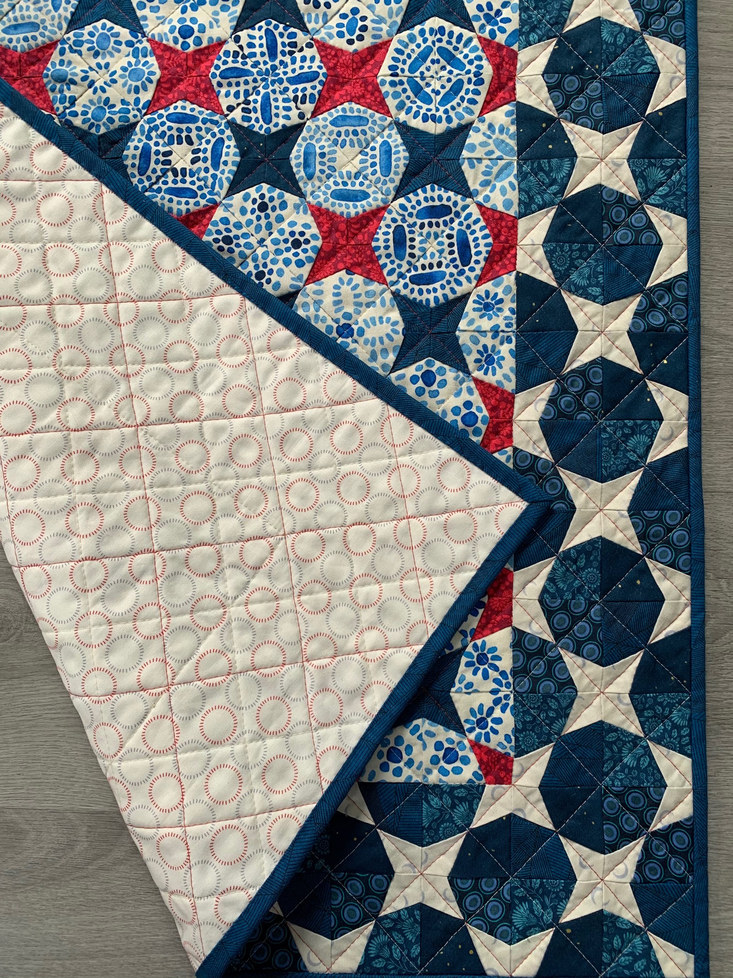 The colours and stars in this quilt remind me of flags; the Union Jack from the UK, the Star-Spangled banner from the USA, and our own New Zealand Ensign.