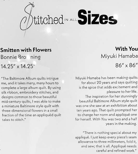 This week, we finish our appliqué tour at the National Quilt Museum in Paducah. Both of the remaining exhibits featured tiny quilts. A full-sized appliquéd album quilt is impressive, and then there are the album quilts that are the size of a typical block. Mind-blowing work. I (Teri) was in awe and inspired to attempt some small stitching.