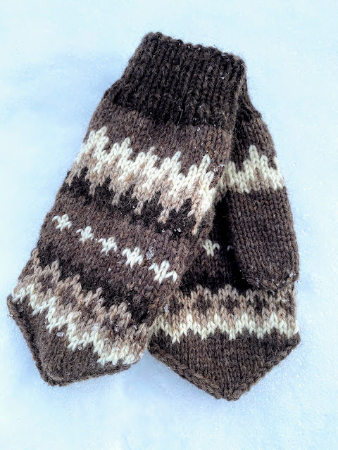 Two new mittens are off the needles, "Rutevotter", men and womens versions.