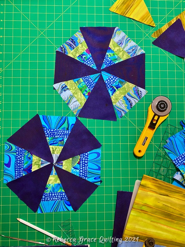 In the photo above, the isosceles triangles have not yet been sewn together into an octagon, but I just loved the way the strippy pieced triangles came out and had to snap a picture. This idea was born of necessity, because I didn't pay attention to the size of the hand dyed fabric pieces in the assortments I ordered from Marjorie Lee Bevis on Etsy and I do not have enough of any one of them to cut four identical 5" x 6" triangles out of ...