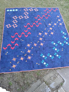 A couple of years ago, I designed the Night Sky Sampler 28 quilt to teach techniques to other quilters in my classes. I used a combination of blocks including one I designed, Spinning Star. Since that star turned out to be a favorite of mine, I wanted to try a design using only it and some small star-colored squares. I wanted the stars and faux stars to be scattered across the quilt which is sometimes harder to do than making rows of blocks. So I spent a lot of time playing with them once I had ...