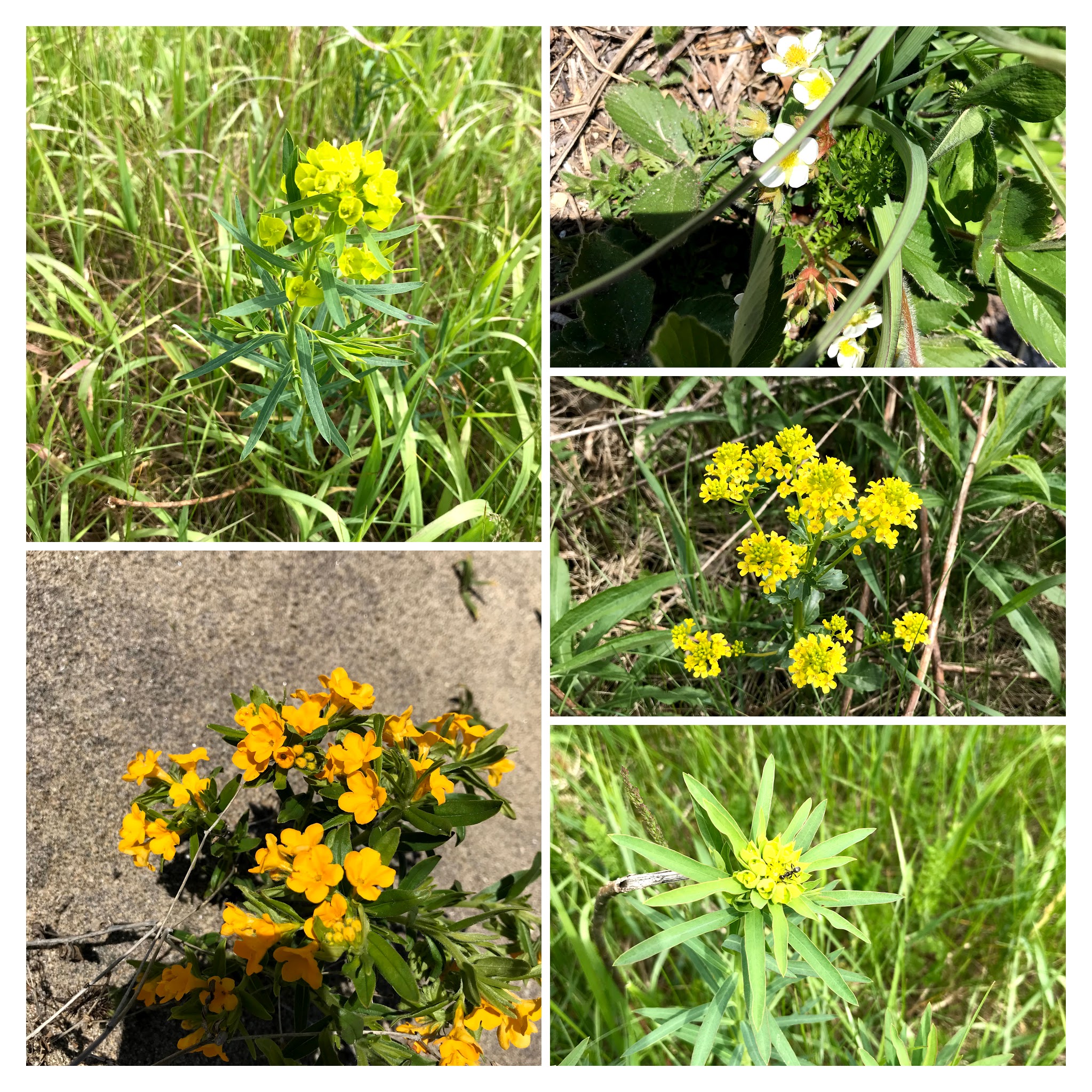 Upper right: strawberries. Middle right: black mustard (an nasty invader). Lower left: puccoon. I haven't identified the other two.