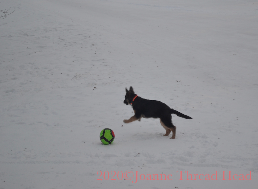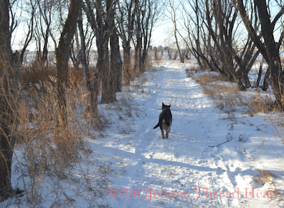 Molly has learned to sit while a vehicle goes by on the highway behind our home.