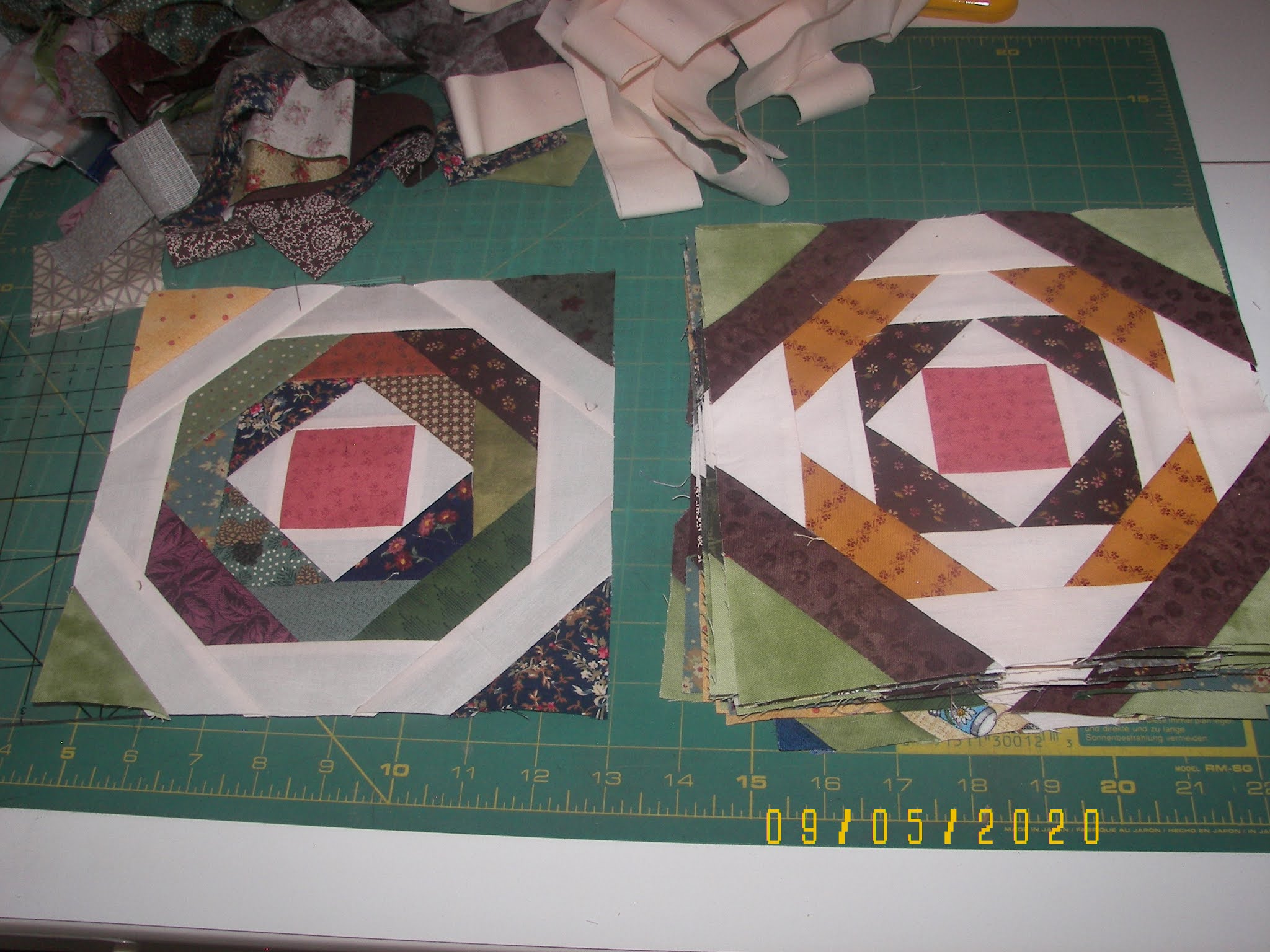When your entire collection of fabrics seem to be ALL scraps and pieces, this is a perfect solution of what can be used. Once again, I used a ruler and suggestion from Gyleen Fitzgerald, because it's smaller than the Creative Grid version. I think next time, I'll try the larger one, just to note any difference. This is 7 x 8 blocks, 8 inch blocks with a 6 inch border., about 68 x 76 in. Note the difference made by the alternate block, with a slightly different value placement. This is my 6th or 7th Pineapple quilt.