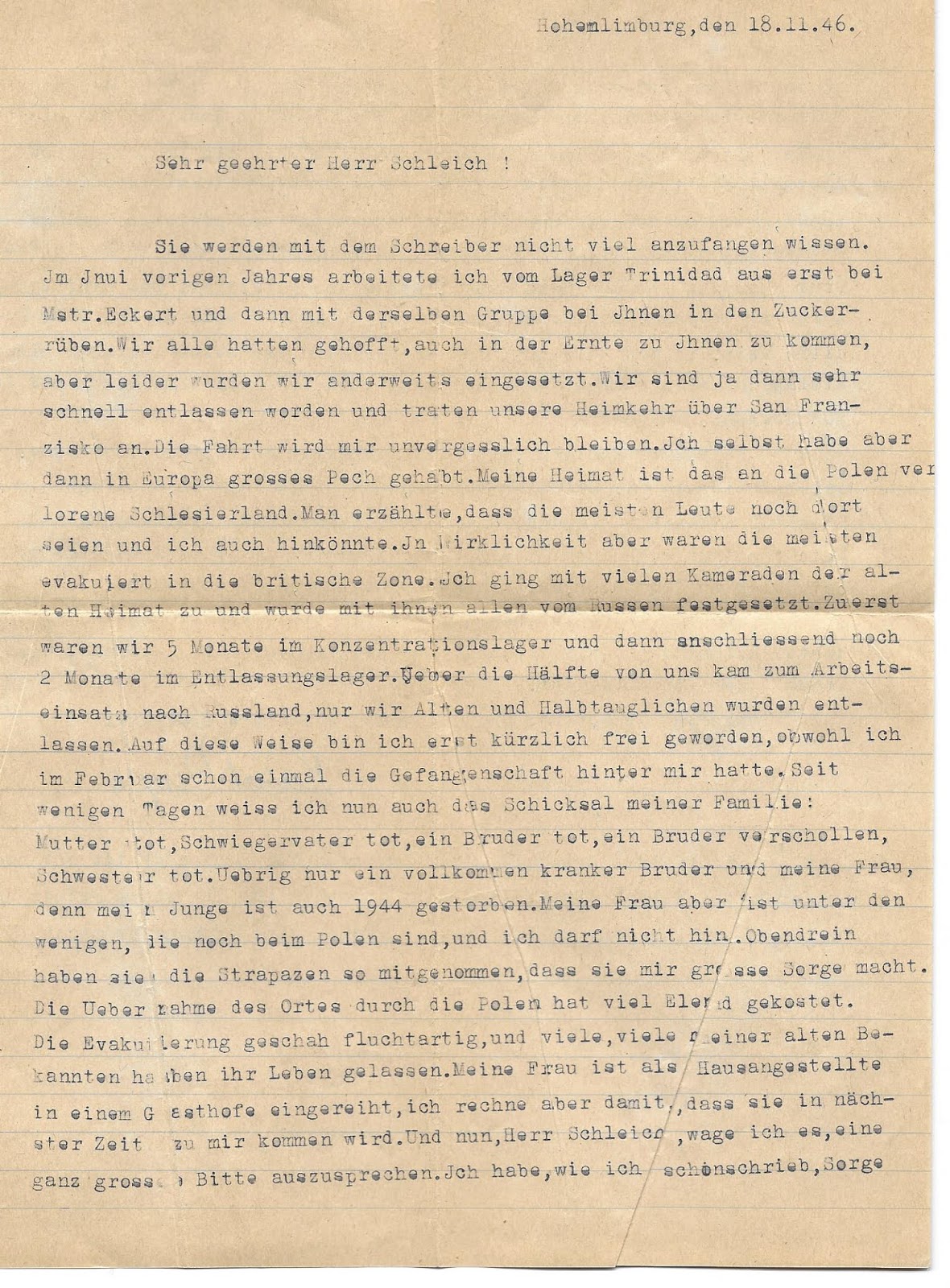 As the year nears the end of 1947, just a few months short of 2 years from when Camp Trinidad was shut down, it would seem that those that that lived in the Russian Zone of Germany were among those that struggled the most. With the lack of housing and food and the harsh winters must have seemed unimaginable and mind-boggling! It also seems fortunate for Mr. Lankau that his wife had relocated OUT of the Russian Zone, yet times are still hard... and he doesn't ...