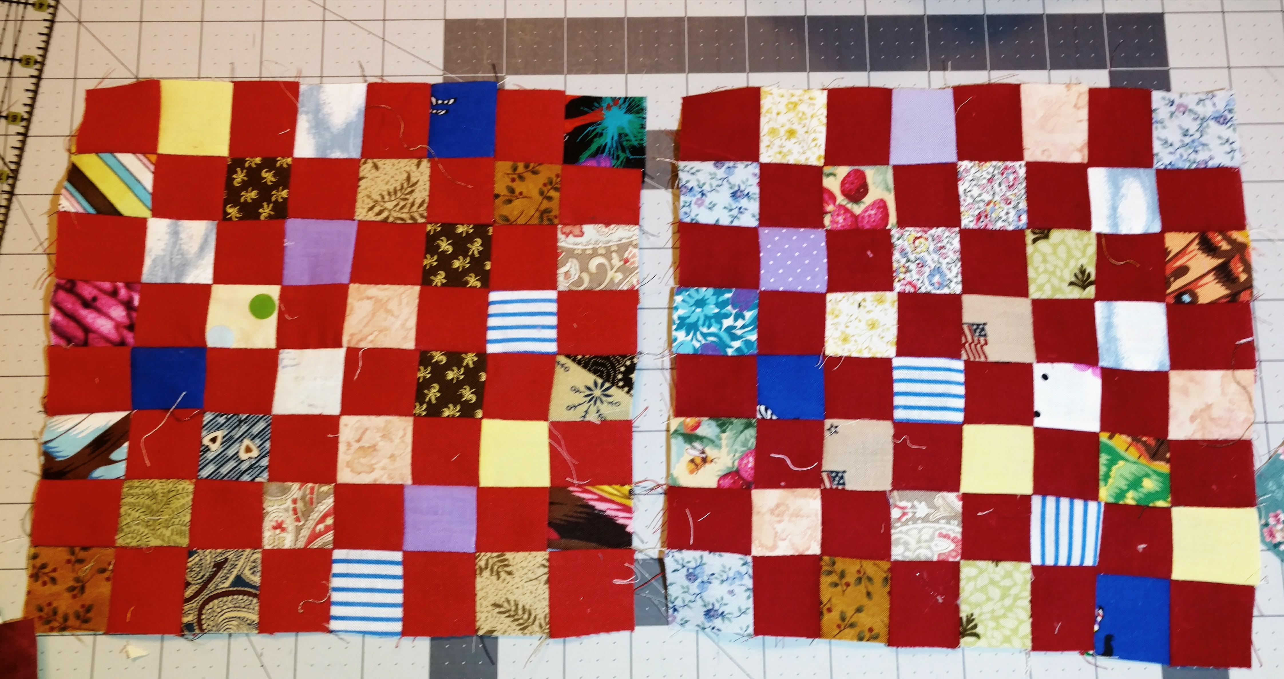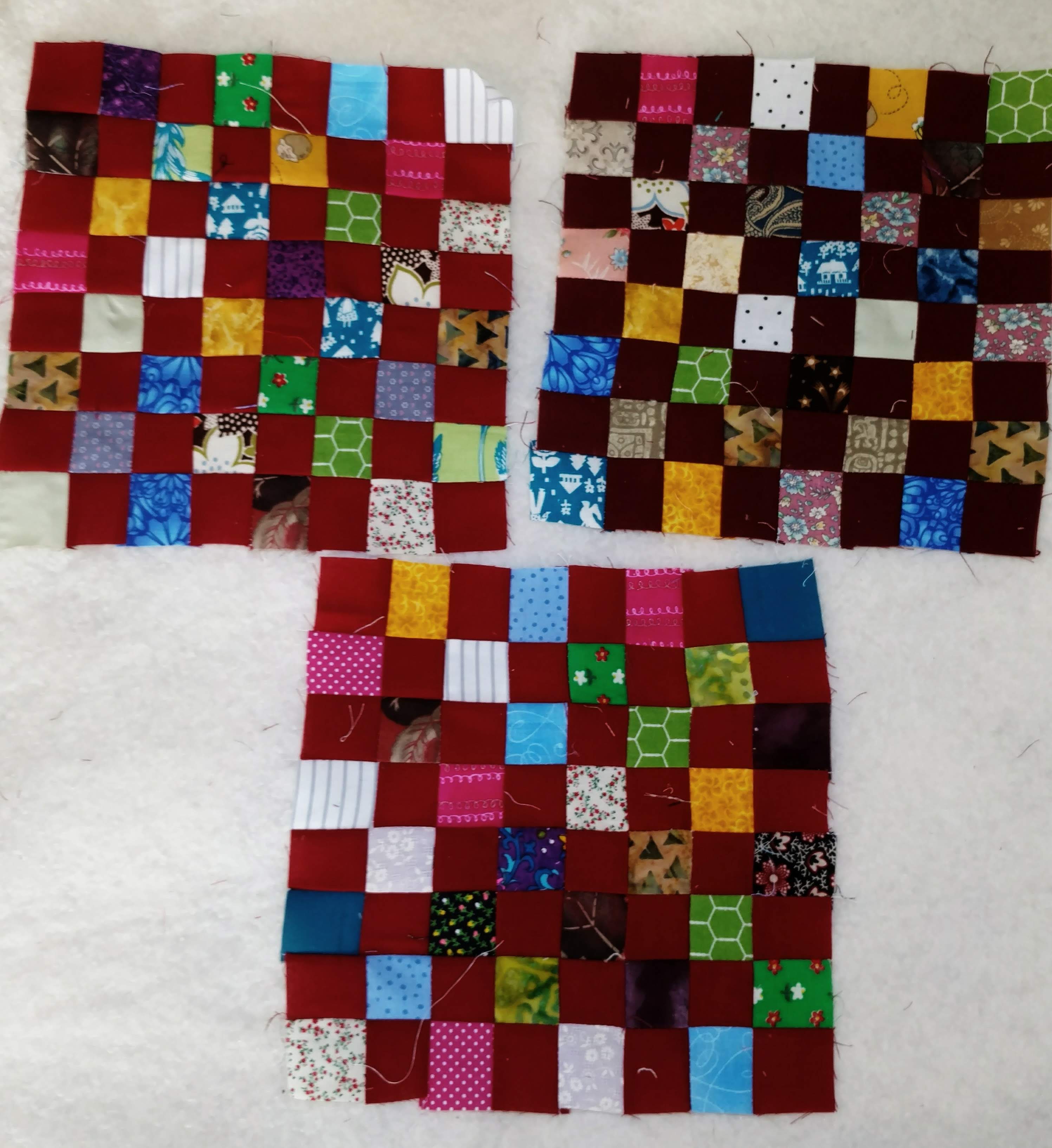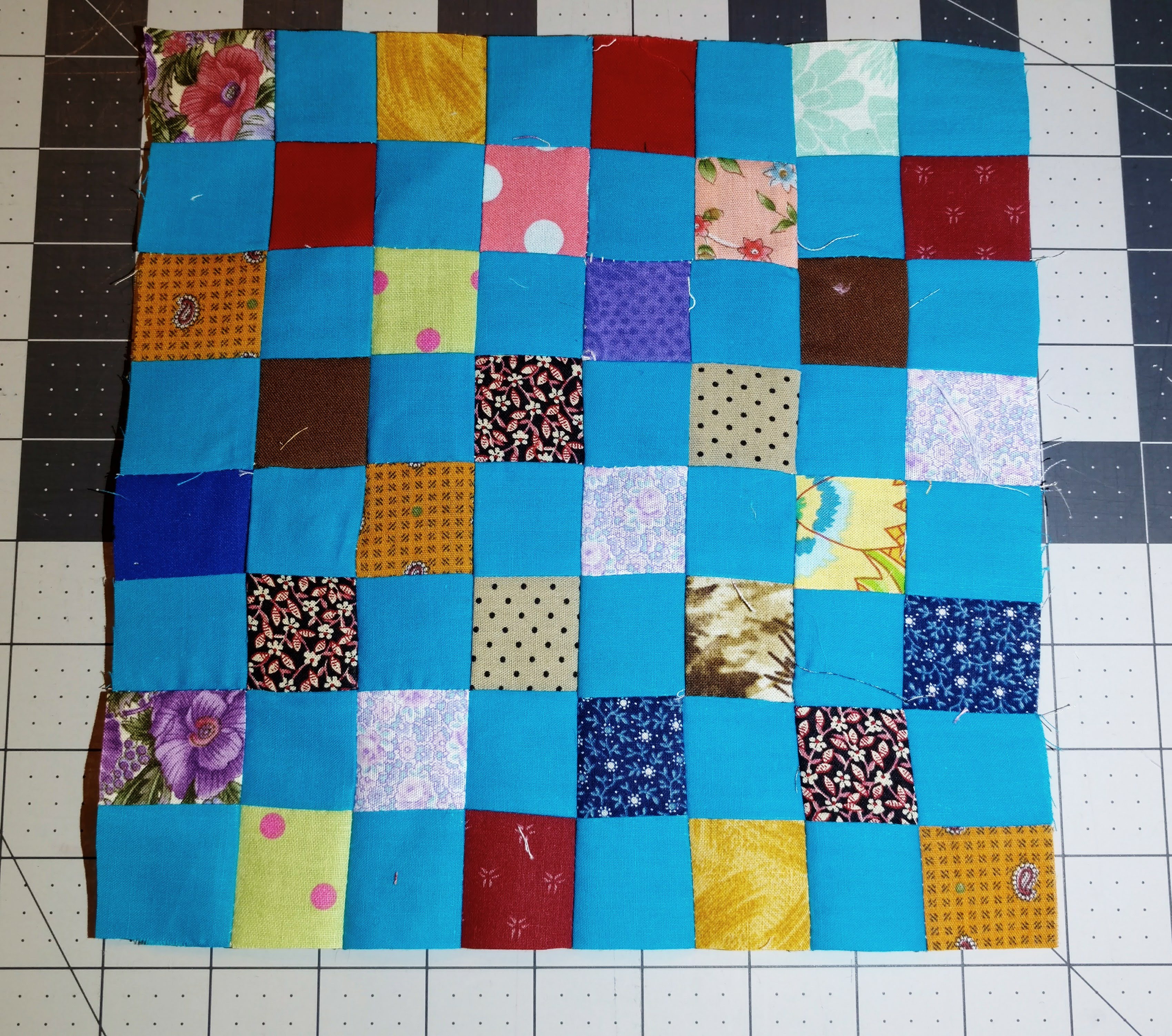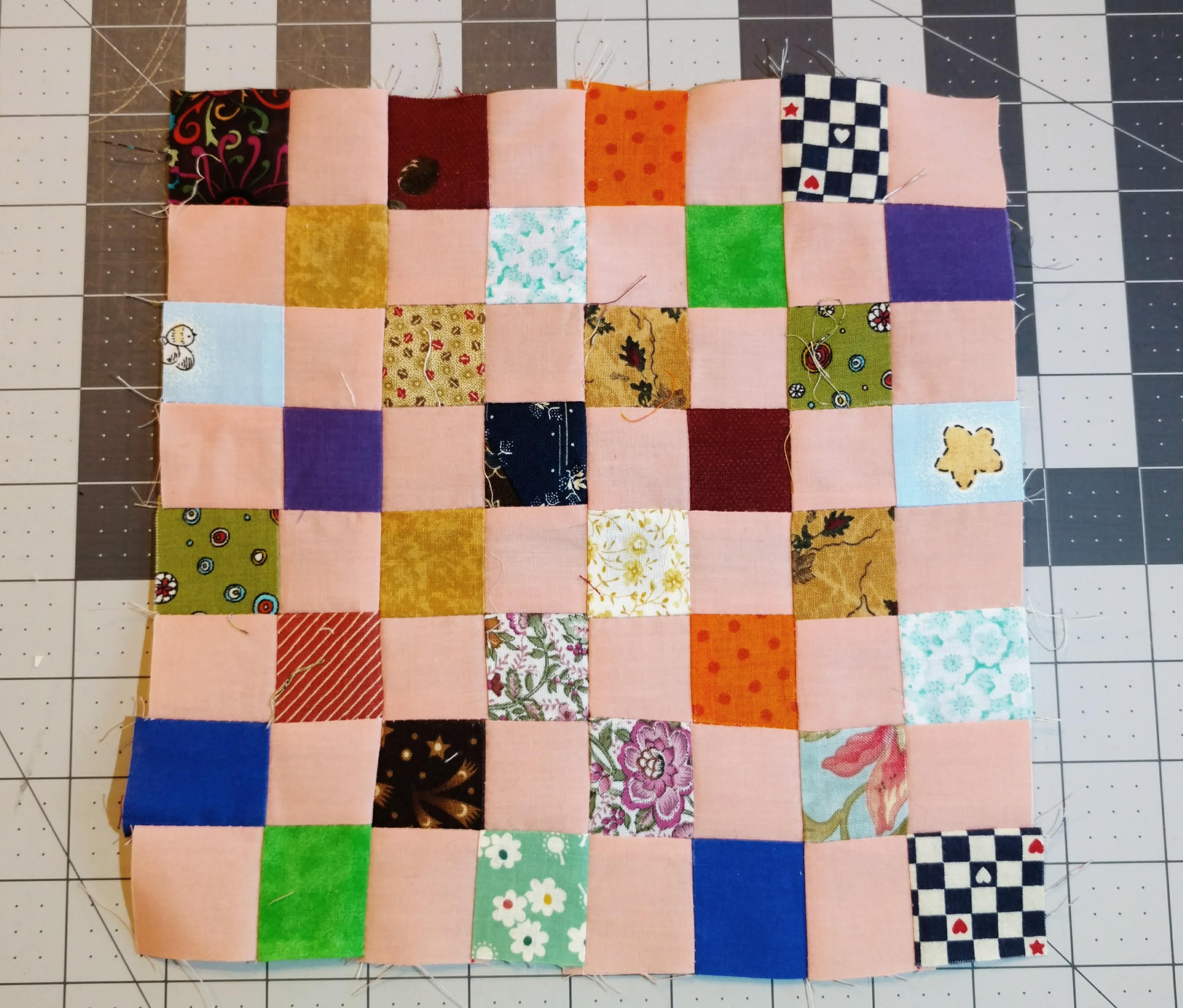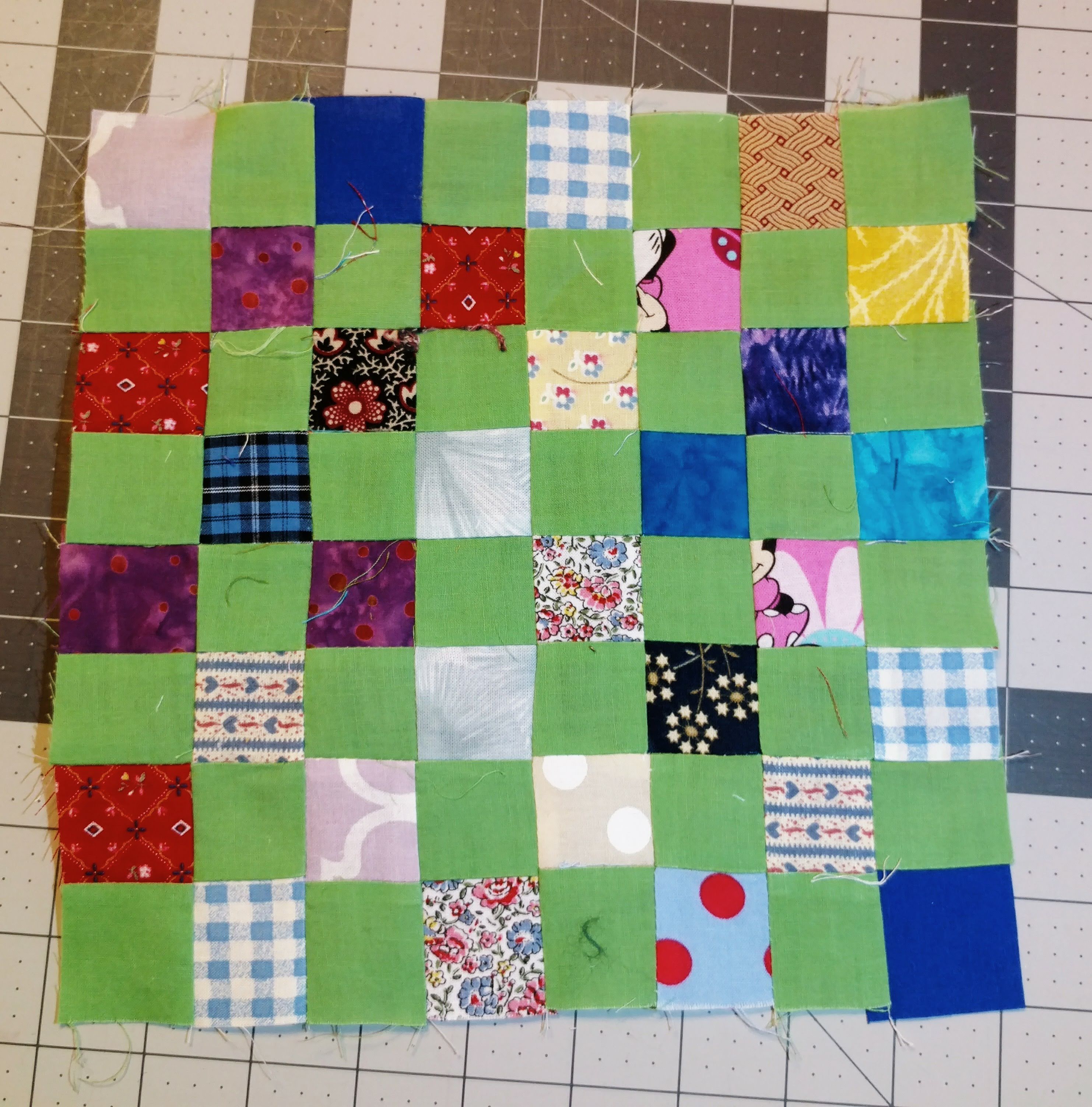 read moreI have had a lot of fun making postage stamp psp20 blocks with 1 1/2 inch squares. Many of my print squares were a gift from a great quilting friend. So, I get a smile every time I start a new block. I went through a little bag of scraps, and, every time I found a piece big enough for the solid color, I cut for the postage stamp block. I think I will have a lot of red blocks. It's amazing how many shades of red I have found hiding in the scrap piles.