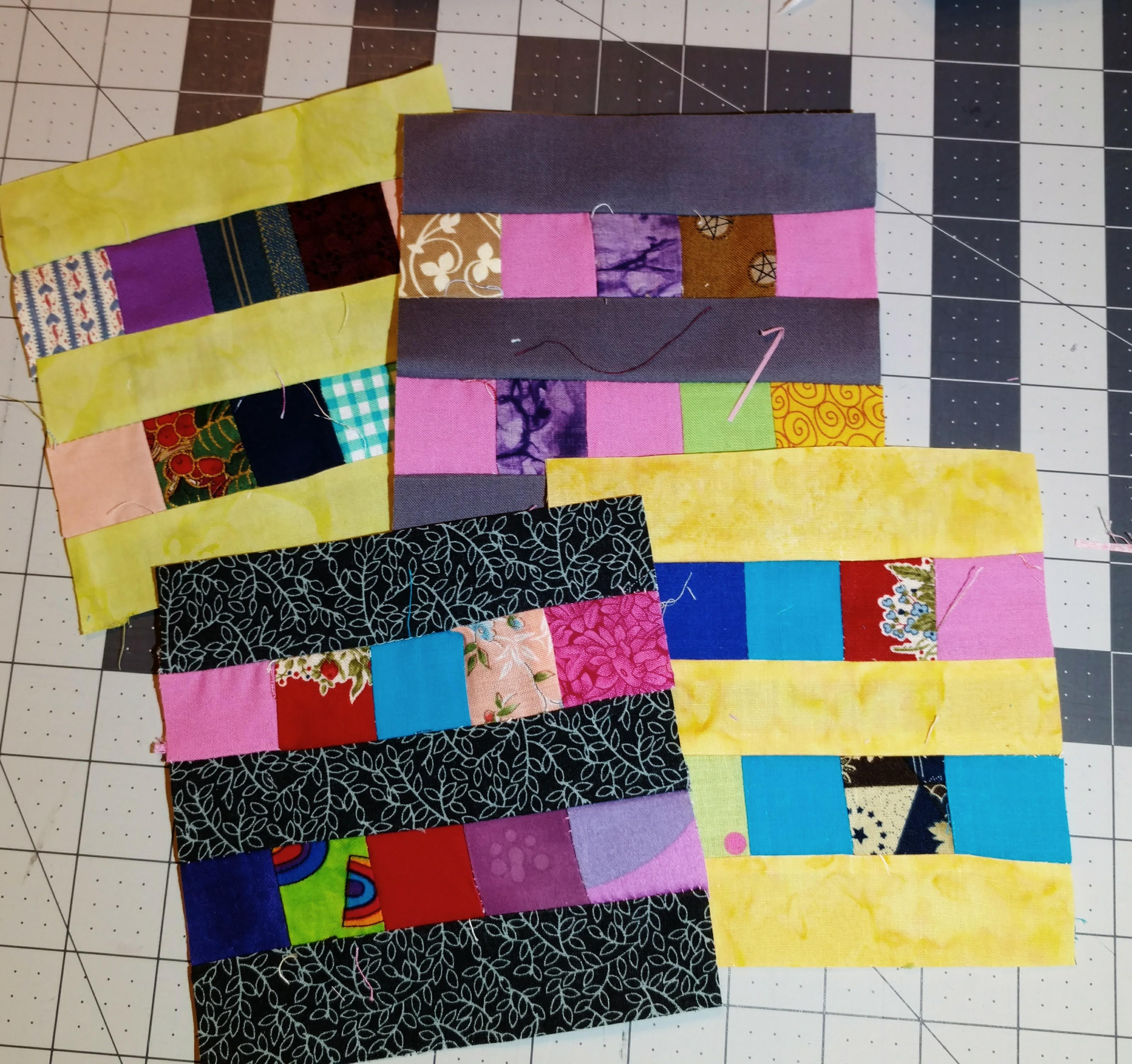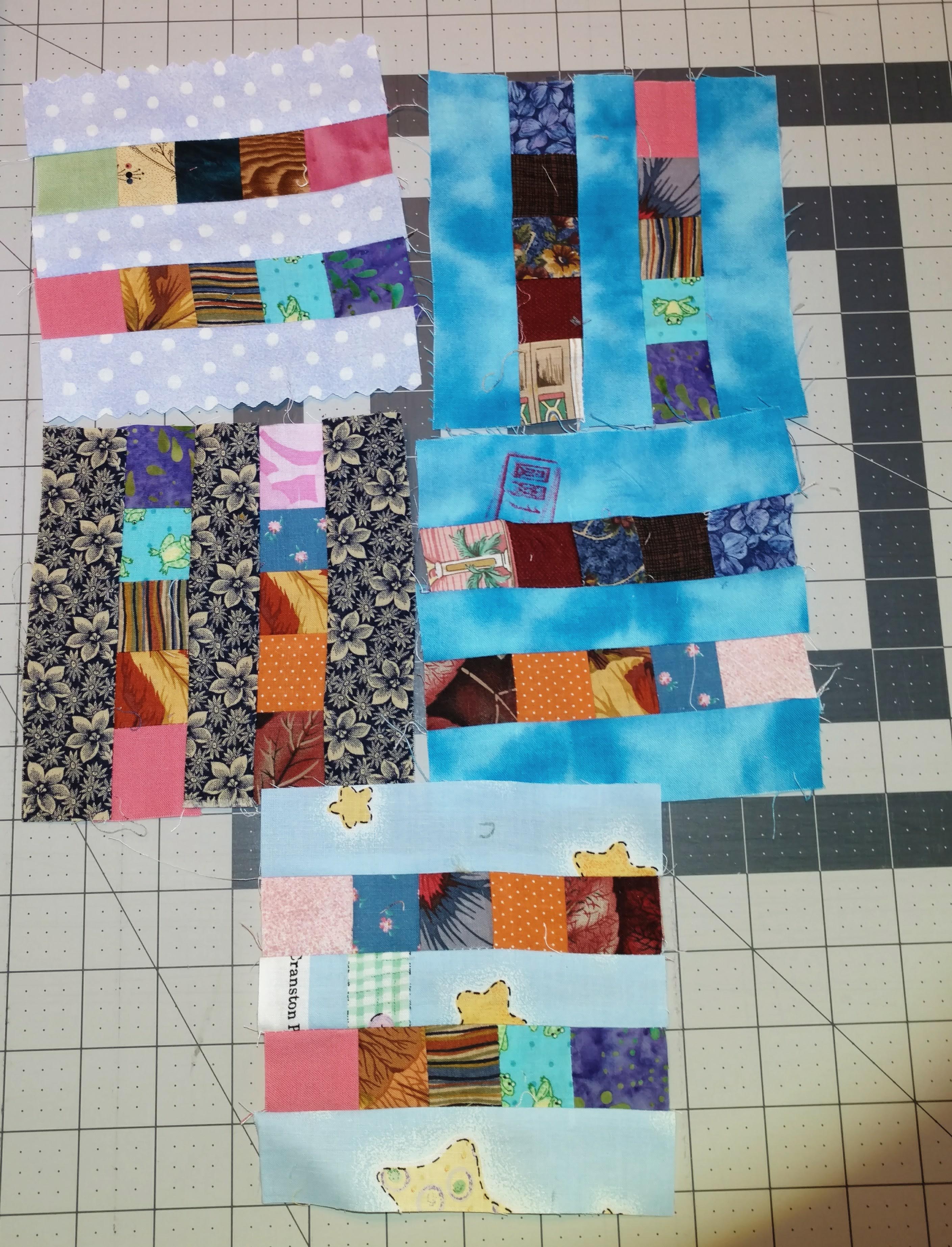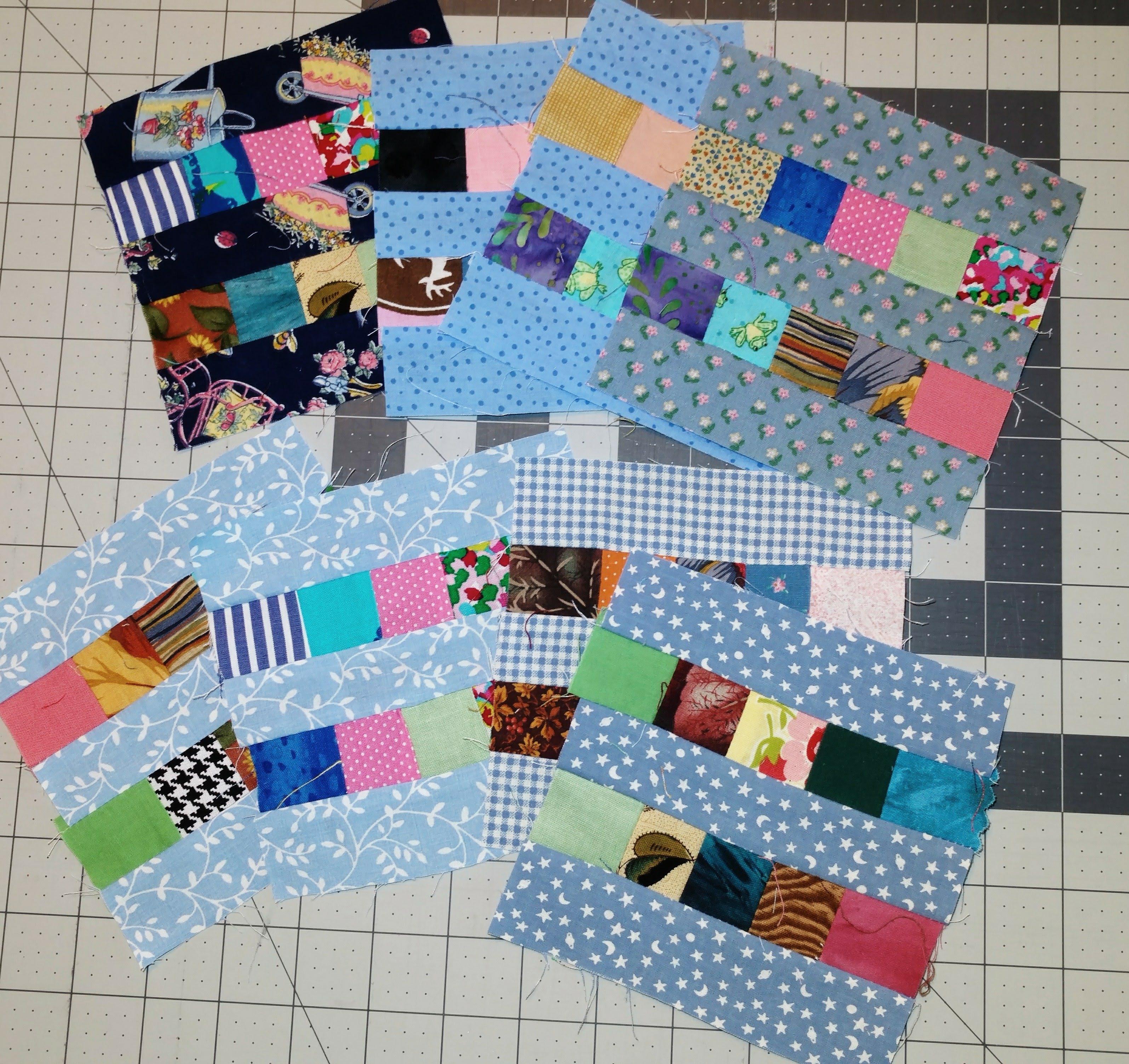 I had enough blue pieces already cut for the waffle stamp blocks. I did not need to cut anymore, so, I was able to get these sewn quickly for the start of the month for the rainbow scrap challenge at so scrappy.