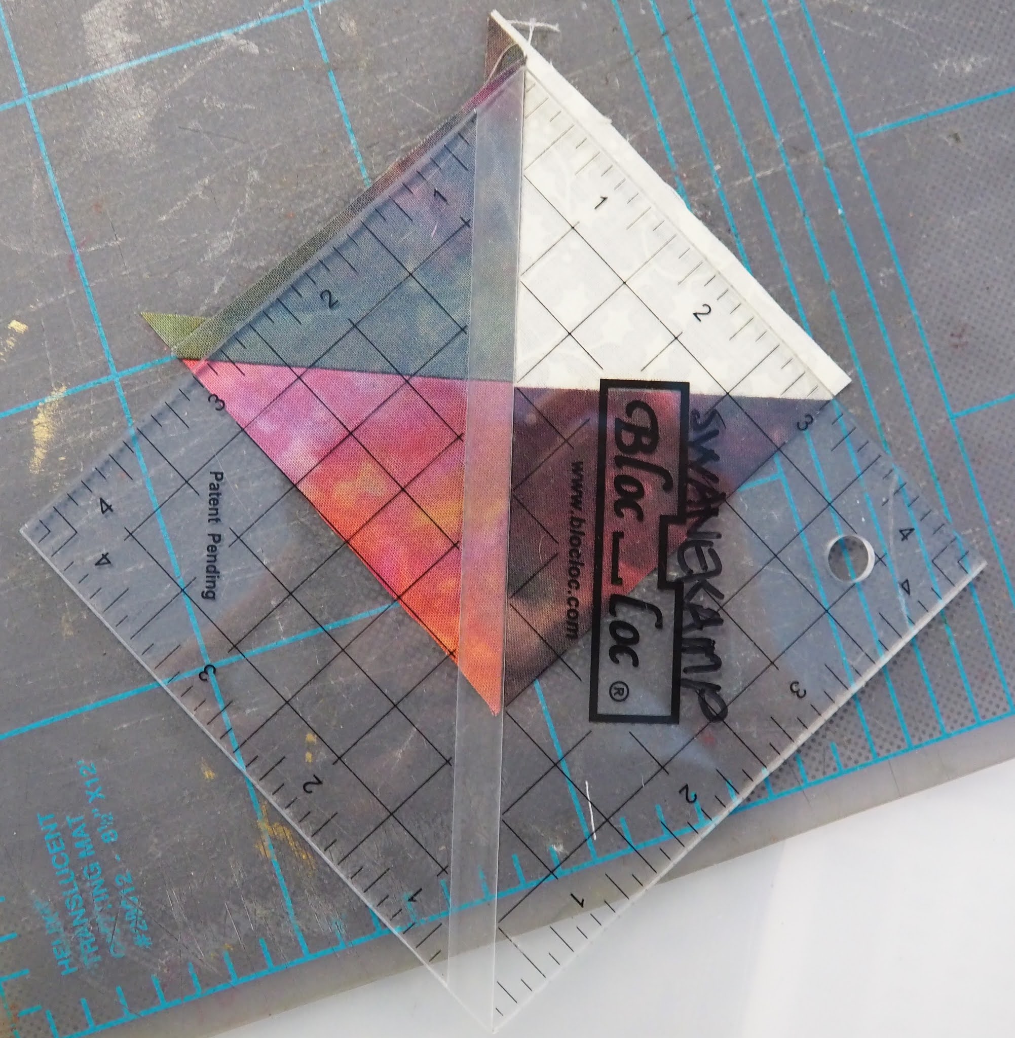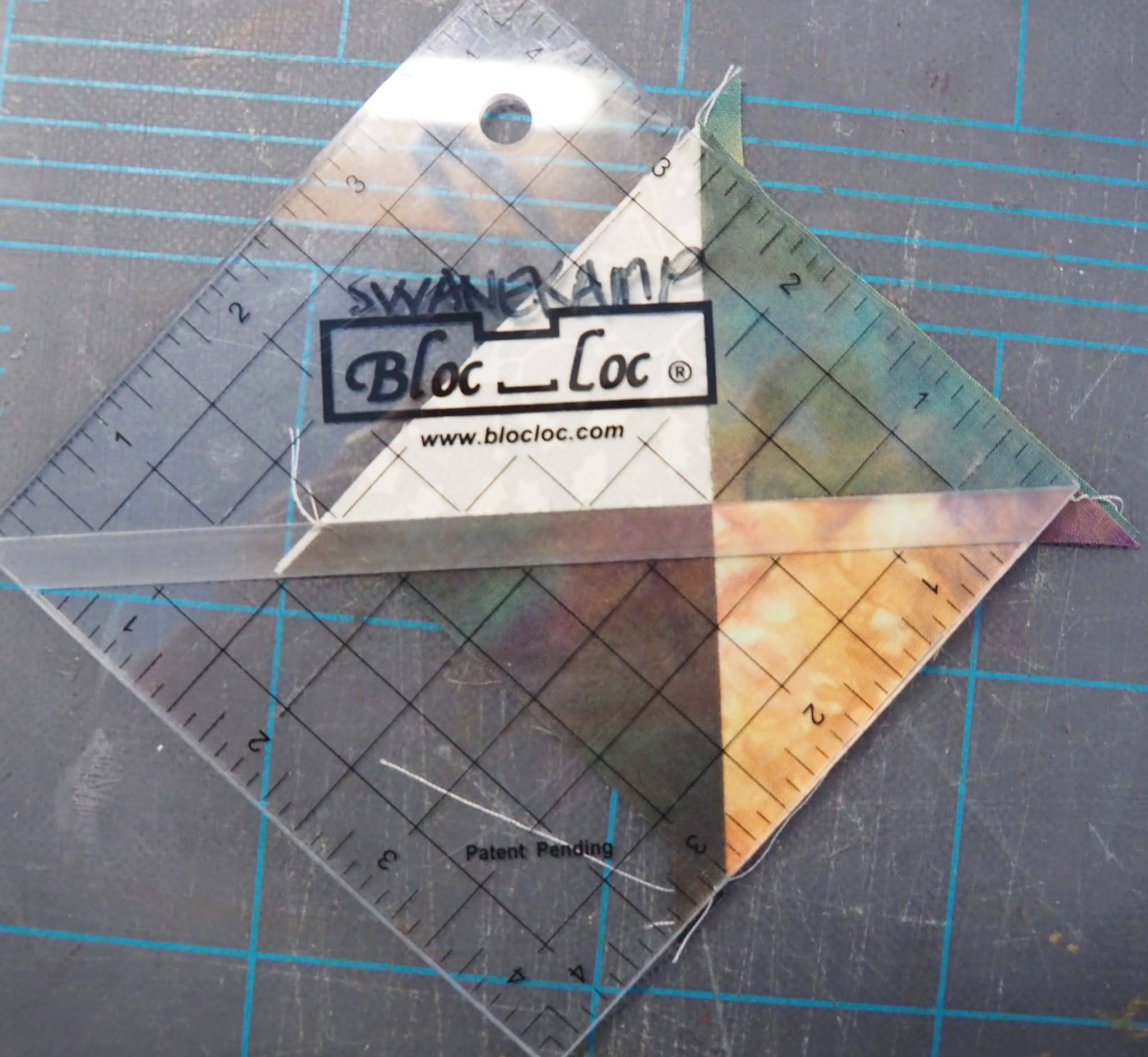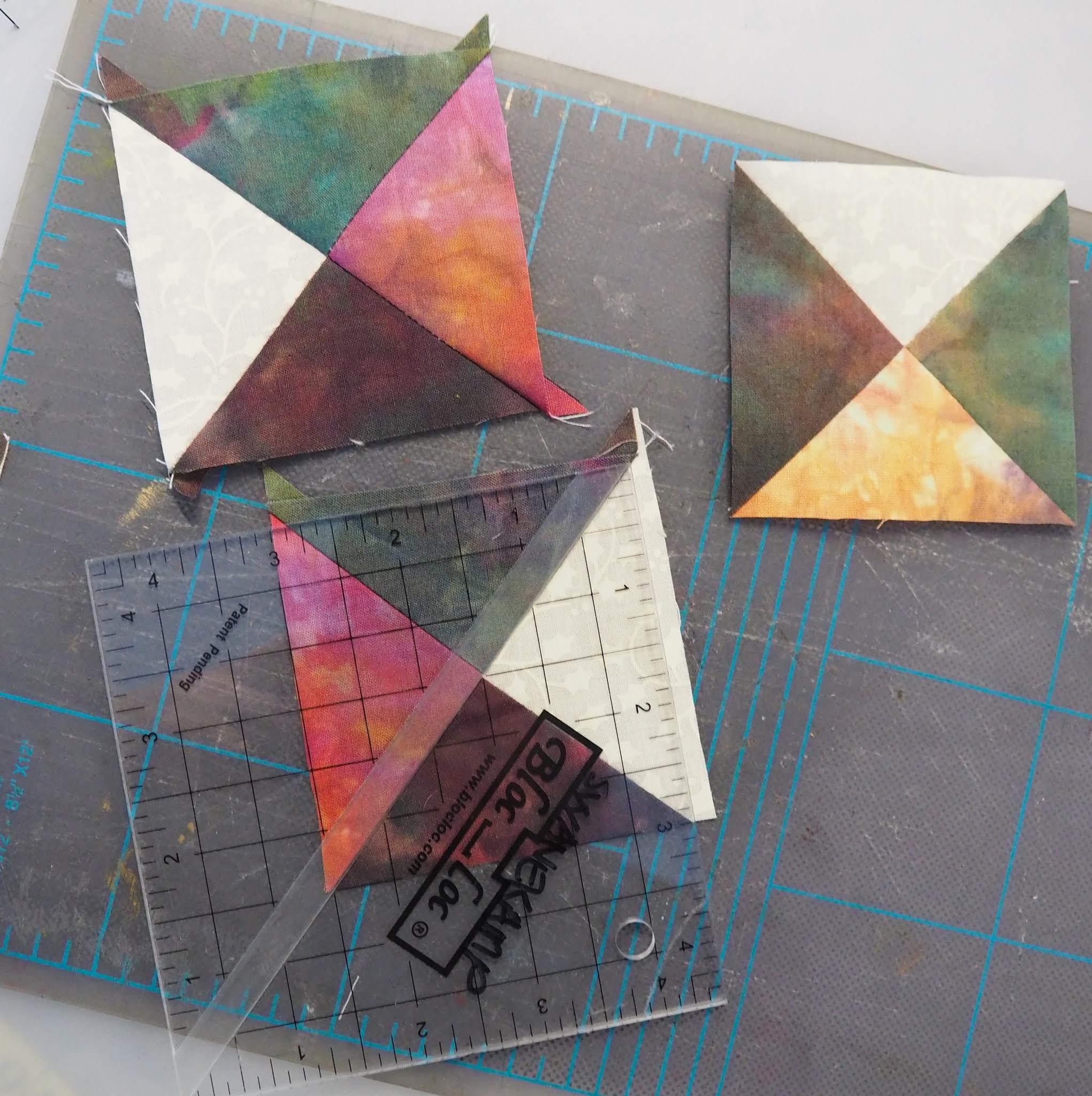 read moreI am caught up with the guild mystery quilt so far. This month was sewing Quarter Square Triangles (QSTs) into a nine patch star, solid color in middle. The QSTs were a breeze to trim using a Bloc Loc ruler.
